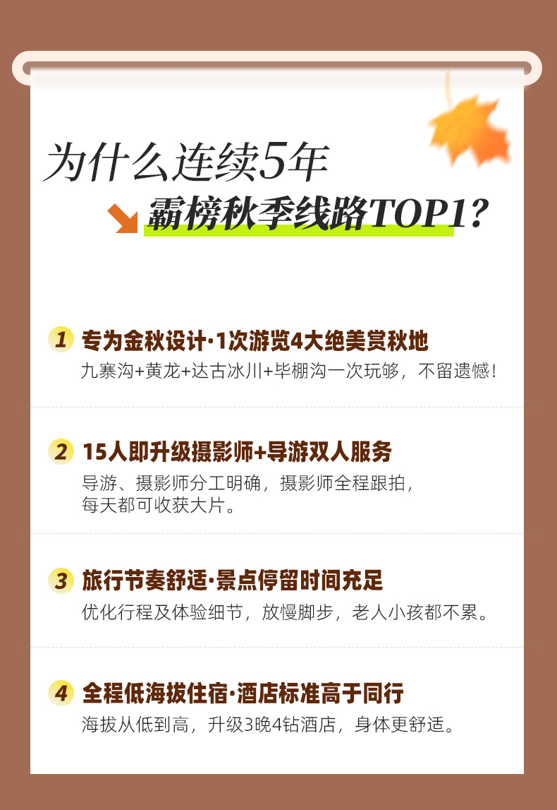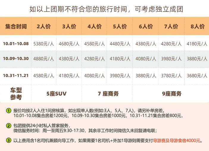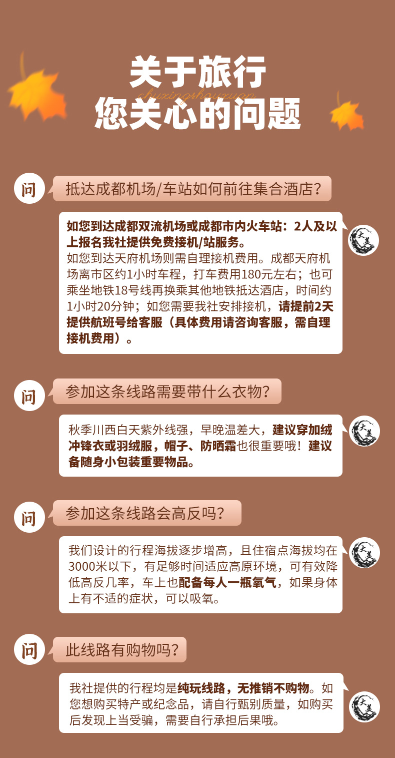 咨询成团、余位 国庆+秋季+初冬限定,仅13期,在对的时间去对的地方。 1人成团,1-5人司机兼向导,6人及以上配纯玩导游,15人即升级摄影师+导游双人服务,28人封队; 第04期:2025.10.16成都集合-------2025.10.21成都完团 第05期:2025.10.19成都集合-------2025.10.24成都完团 第06期:2025.10.21成都集合-------2025.10.26成都完团 第07期:2025.10.24成都集合-------2025.10.29成都完团 第08期:2025.10.26成都集合-------2025.10.31成都完团 第09期:2025.10.29成都集合-------2025.11.03成都完团 ) —第03期至第09期金秋特辑,3680元/人,单房差1000元/人— 第10期:2025.10.31成都集合-------2025.11.05成都完团 第11期:2025.11.07成都集合-------2025.11.12成都完团 第12期:2025.11.14成都集合-------2025.11.19成都完团 第13期:2025.11.21成都集合-------2025.11.26成都完团 —第10期至第13期初冬特辑,3480元/人,单房差800元/人— 活动有自费项,注意查看费用不含 线路纯玩,不安排购物点 |
