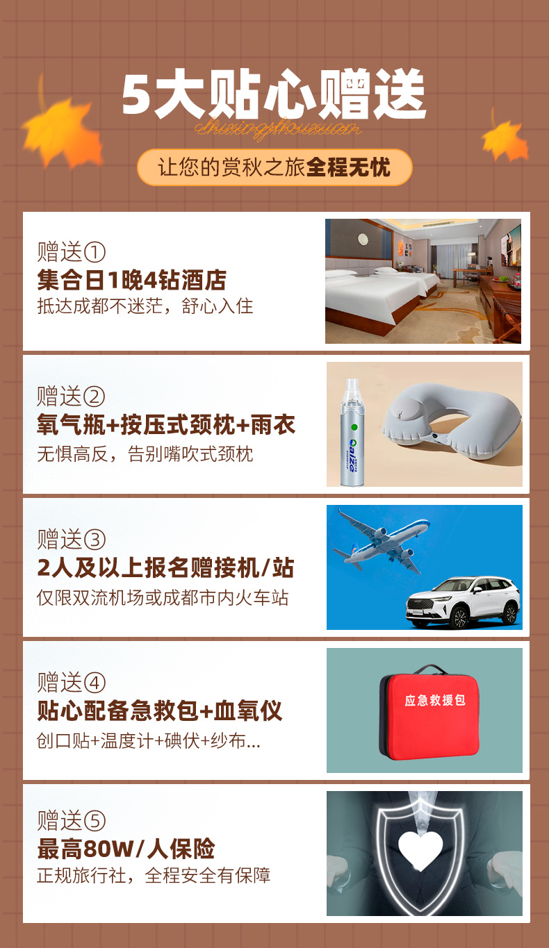 1、藏式人文体验:藏家主人献哈达、喝酥油茶、围着篝火跳锅庄; 2、15人及以上安排摄影师跟拍:赠8张简修+底片全送(电子版); 注:为了保证每个人的拍摄数量,请各位主动跟随摄影师,找摄影师登记拍摄哦!如因个人原因没有登记,导致拍摄数量不够,与我社无关! 3、2人及以上报名赠双流机场接机/成都市内火车站接站(天府机场接机需自理费用); 4、全程5个早餐+1个特色餐(藏式土火锅),如队员另外点餐,需自己支付费用; 5、最高保额为80万元的旅游意外险(不含财产险),中国银保监会规定:不满10周岁80万的额度下降至20万,已满10周岁但未满18周岁80万的额度下降至50万; 注:旅行社赠送一份旅游意外保险,如发生意外事件,该意外保险理赔的金额优先抵扣旅行社可能承担的赔偿金额。港澳台及外籍人士,仅限大陆三甲医院就医才可报销,如离开大陆就医不予报销。 6、颈枕+两件式套装雨披+瓶装氧气,每人一套。 注:接机/站请提前2天告知航班号/车次,否则视为放弃此服务;赠送项目如客人自愿放弃或因特殊原因及不可抗力等原因无法参加,均不退费用,也不等价交换。 |