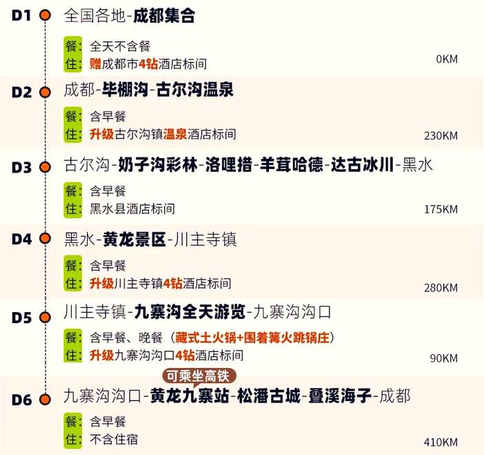 D6 | 第6天,九寨沟沟口-黄龙九寨站(可乘坐高铁)-松潘古城-叠溪海子-成都 | |