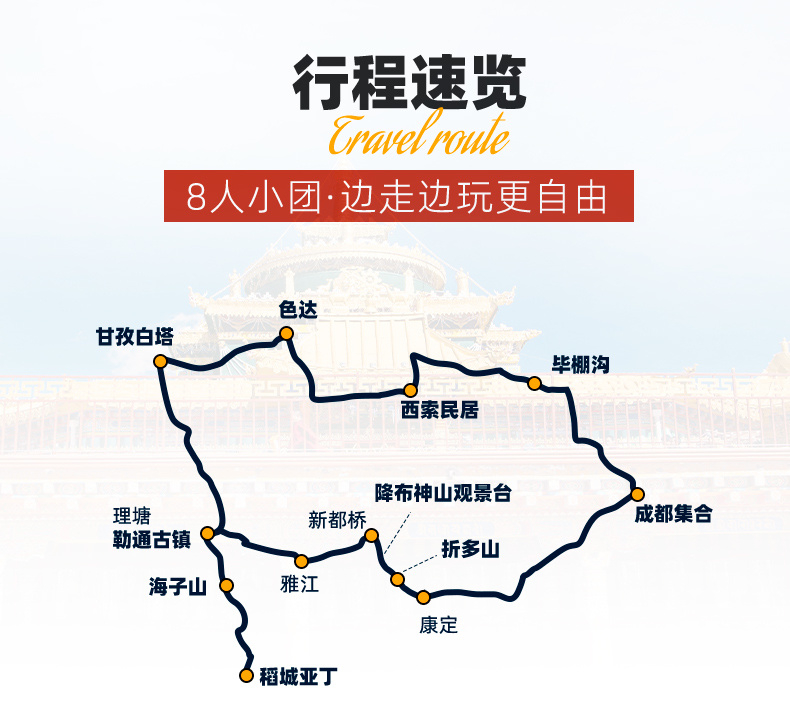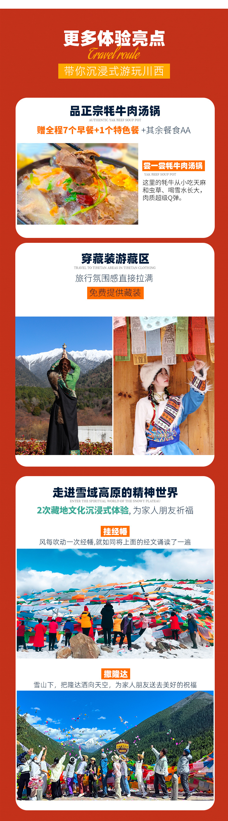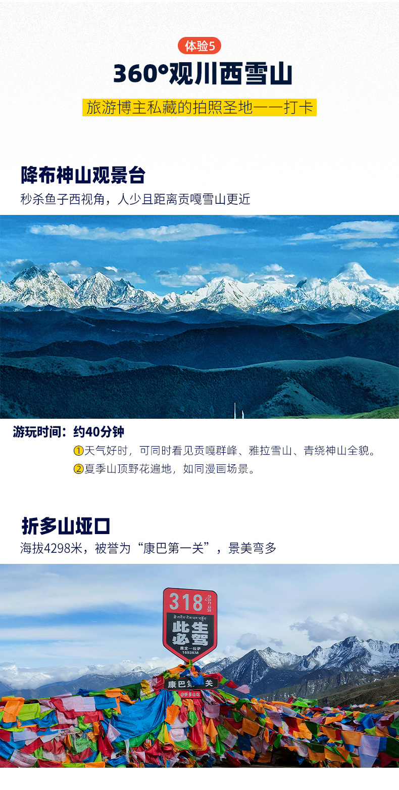 早餐后从雅江出发,穿过高尔寺山遂道, 便来到了令人神往的“摄影天堂”【新都桥】, 这里仿若一片如诗如画的世外桃源, 神奇的光线,无垠的草原,弯弯的小溪,山峦连绵起伏,藏寨散落其间,牛羊安详地吃草…… 川西平原风光在此美丽地绽放。 而后换车前往一处比鱼子西更小众、距离贡嘎雪山更近的观景台——【降布神山观景台】, 天气好时,可以同时看见【贡嘎群峰】、【雅拉雪山】、【青绕神山】全貌, 在这里随手一拍,皆是大片! 山顶的秋千、经幡长廊更是网红拍照打卡地。 游玩后越过【折多山】,在这里您可以观赏到【川藏第一关祈愿墙】(网红打卡点), 上面摆放着“扎西德勒、一路顺风、吉祥如意”等字样的祈愿石。 打卡后继续朝着甘孜藏族自治州首府——《康定情歌》中的康定行进, 随后上雅康高速,穿越二郎山隧道,感受阴阳两重天, 经雨城雅安上成雅高速返回成都。 特别提醒: (1)如遇暴雨、路损等不可抗力降布神山观景台不开放,我们将放弃游览,请知悉; (2)如因交通管制、堵车等,G318(折多山)无法通行,我们将改走S434机场路(红海子)方向; (3)以上行程时间安排可能会因天气、路况等原因做相应调整,正常情况下完团回到成都的时间为晚上17:00-18:00,散团点距离成都双流机场约30分钟车程,距离天府机场约1小时车程,建议预订次日离开成都的大交通,如果必须当日离开,请定21:00以后起飞的回程大交通,以免耽误行程; (4)以上行程及时间仅供参考,具体以实际出发行程及时间为准,在不减少景点的情况下,我公司有权调整行程游览的先后顺序。 |