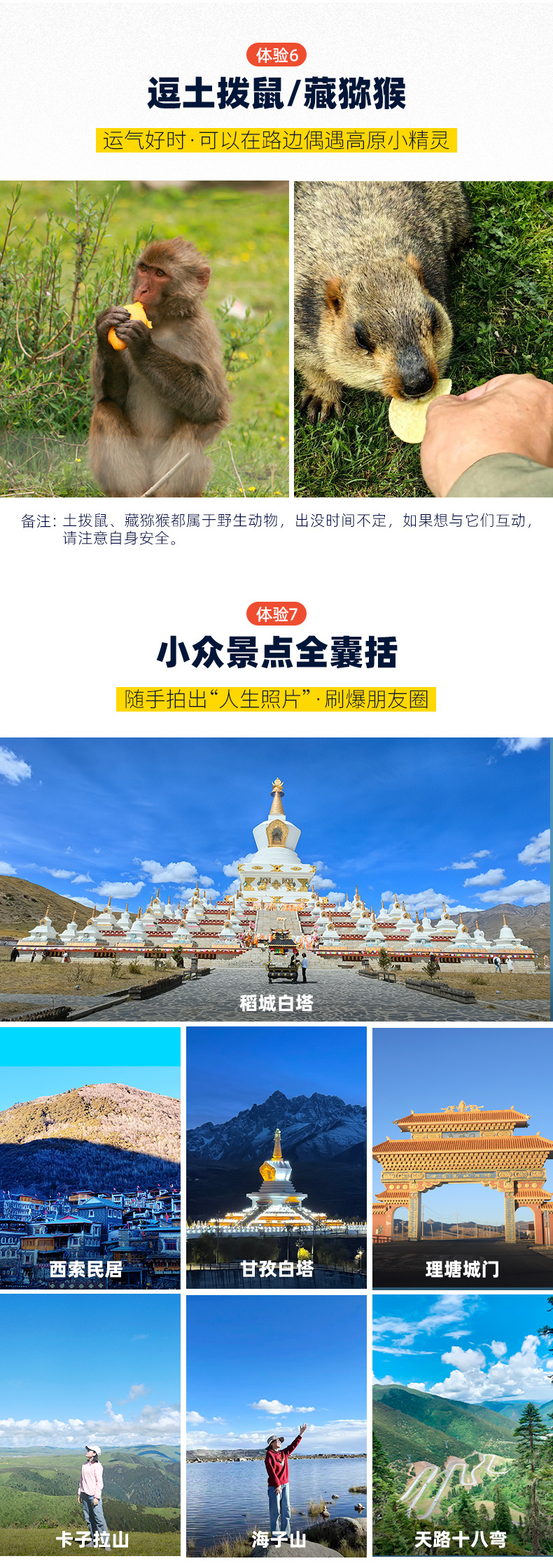 早餐后离开马尔康, 经【卓克基官寨】、【西索民居】,感受藏族土司文化, 大多数人或许并不知道这个地方, 但是对于喜欢藏族土司文化的朋友,想必对这里一定有所耳闻。 这里是小说《尘埃落定》的故事原型地及电视剧的外景拍摄地。 游览后继续行车,沿途欣赏田园风光, 一路上美景不断,远处的黑色牦牛与白色羊群若隐若现, 微风吹来云朵般柔和的牧歌,幸运的话, 路上还可以偶遇到野生藏猕猴和憨憨土拨鼠, 如果想与它们互动,一定要注意自身安全。傍晚抵达色达入住。 特别提醒: (1)如队员想要游览卓克基官寨,请自理门票60元/人; (2)土拨鼠、藏猕猴都属于野生动物,出没时间不定,如果想与它们互动,请注意自身安全。 |