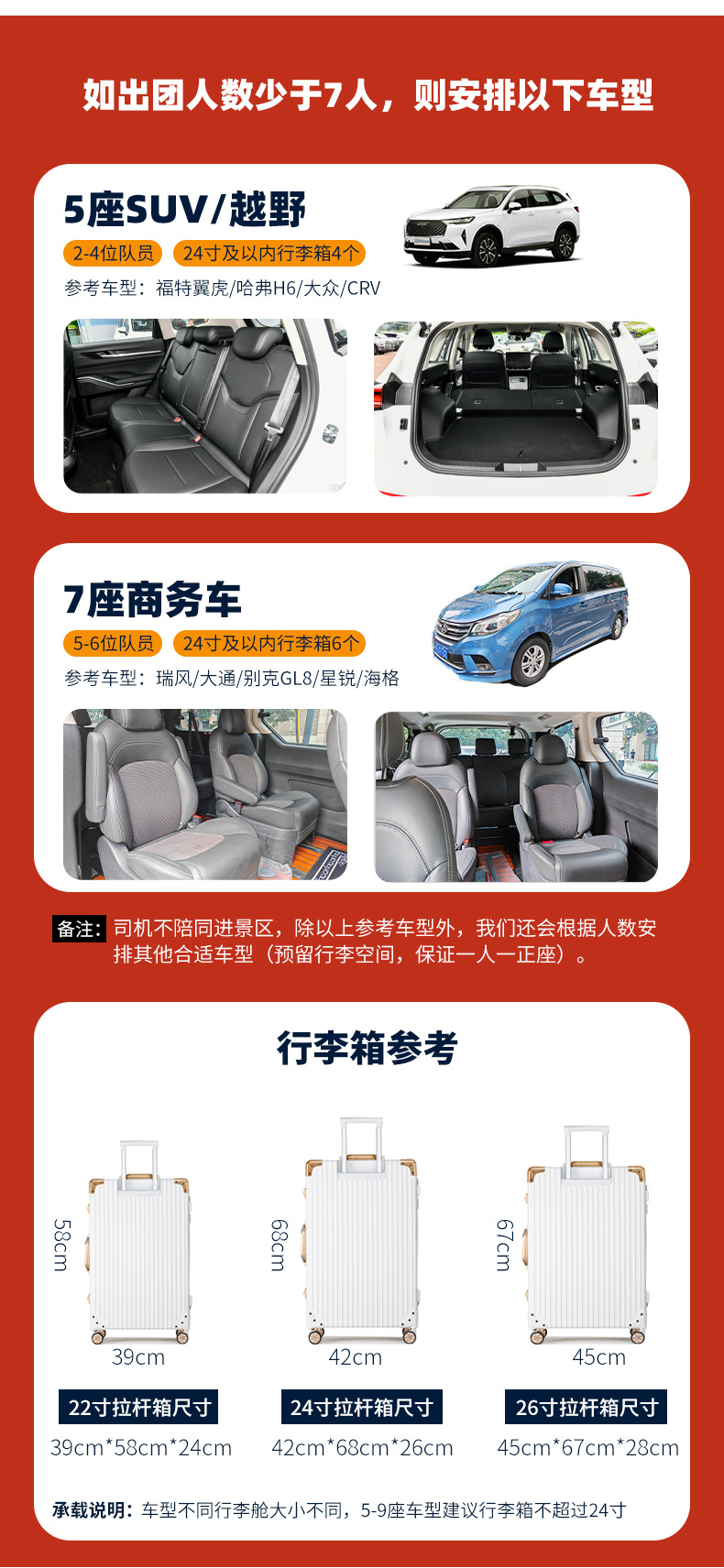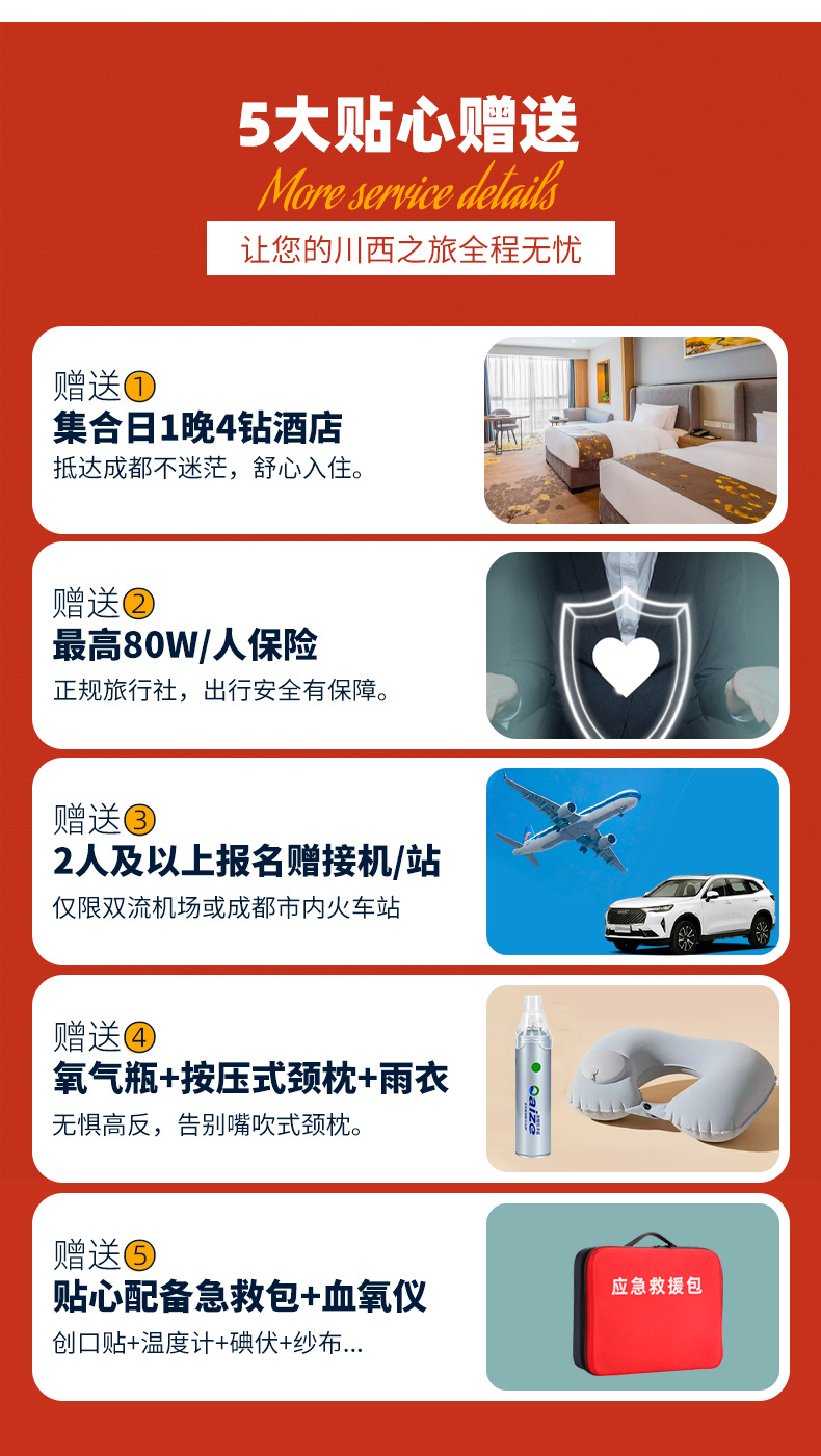 1、交通:根据人数确定车辆(全程司机兼向导,已含驾驶员食宿,驾驶员熟悉线路,会给队员提供行程建议,全程边走边玩,保证多次停车服务,但不会像专业导游一样解说,且不陪同队员进景区,请理解); 2-4位队员乘坐5座SUV/越野; 5-6位队员乘坐7座商务车; 7-8位队员升级9座新款豪奢保姆车(配无人机); 2、住宿:全程7晚住宿(含集合日赠送1晚4钻酒店、不住不退); 3、门票:毕棚沟门票、稻城亚丁门票、勒通古镇门票及观光车、降布神山观景台清洁费及转运费; 4、赠送: (1)藏地人文体验:挂经幡+撒隆达; (2)用餐:全程7个早餐+1个特色餐(牦牛肉汤锅),如队员另外点餐,需自己支付费用; (3)2人及以上报名赠双流机场接机/成都市内火车站接站(天府机场接机需自理费用); (4)最高保额为80万元的旅游意外险(不含财产险),中国银保监会规定:不满10周岁80万的额度下降至20万,已满10周岁但未满18周岁80万的额度下降至50万; (5)颈枕+两件式套装雨披+瓶装氧气,每人一套; 注:港澳台人士仅限大陆三甲医院就医才可报销,如离开大陆就医不予报销。接机/站请提前2天告知航班号/车次,否则视为放弃此服务;赠送项目如客人自愿放弃或因特殊原因及不可抗力等原因无法参加,均不退费用,也不等价交换。 5、随团配备: (1)免费提供藏装; (2)急救包+血氧仪+温度计,随时观察了解客人的身体状况。 |