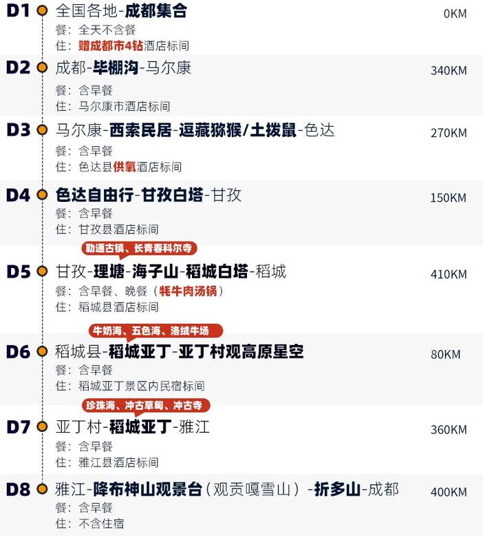 咨询成团、余位 第26期:2025.09.30成都集合-------2025.10.07成都完团 第27期:2025.10.01成都集合-------2025.10.08成都完团 —第26/27期国庆特辑,4980元/人,单房差1800元/人— 第28期:2025.10.11成都集合-------2025.10.18成都完团 第29期:2025.10.18成都集合-------2025.10.25成都完团 第30期:2025.10.25成都集合-------2025.11.01成都完团 —第28期至第30期,4080元/人,单房差1200元/人— 第31期:2025.11.01成都集合-------2025.11.08成都完团 第32期:2025.11.08成都集合-------2025.11.15成都完团 —第31期至第32期,3680元/人,单房差900元/人— 线路纯玩,不安排购物点 |