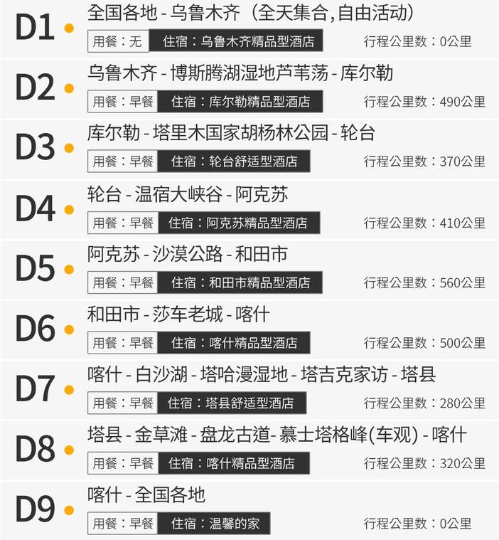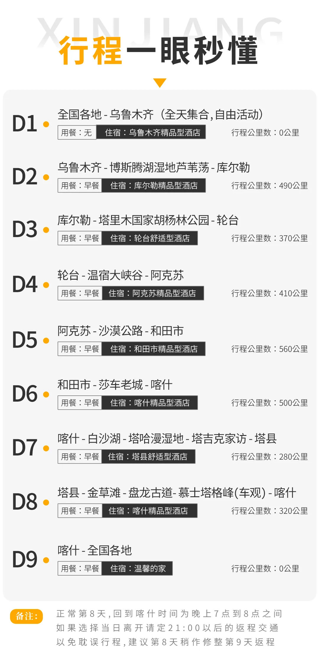 1、行程中的气温怎么样?备什么样的衣物比较好?带什么行李箱比较好? 因为是南疆行程,所以尽管是这个时间段,相对北疆的喀纳斯等地来说,我们这条线路是相对暖和的,但是,毕竟要到帕米尔高原,而且还有早晚温差大的问题。所以,建议还是要备有薄羽绒或是带有抓绒的冲锋衣这样的保暖衣物。夏装已经完全用不上了,春秋装和初冬装是这线的常备衣物。保暖衣服(如:冲锋衣、冲锋裤、抓绒衣、抓绒裤)保暖手套、运动鞋(或休闲鞋)、水壶、太阳镜、带沿的帽子、唇膏、防晒霜(SPF30++以上)、垃圾袋、常备药品、个人用品(如洗漱用品、换洗衣物、袜子等),这些都是必备的。行李箱还是建议带个拉杆箱和一个双肩小背包,所到之处基本我们大巴车都跟着,拉杆箱就放在车子的行李仓里,双肩包背着进景区玩比较方便,包里装些相机,水啊,零食啊,照相及臭美用的纱巾啊什么的比较方便。 2、行程中行程有难度吗?有海拔吗?高度怎么样? 南疆地域辽阔,行车时长,比较大的难度就是坐车时间比较长。基本没什么长时间的徒步,也没什么爬山,在塔河胡杨林,只要你喜欢,也可以走上好几个小时,所以有一双舒适的旅游鞋和一双拖鞋(玩沙漠的时候用得上)和一个好心情很重要。 从喀什到塔县这一天,我们就是要进到帕米尔高原了,路上经过并游玩的卡拉库里湖,海拨是3600米,塔什库尔干县城海拔是3100米。 3、行程中要办边防证吗? 要办边防证。到时领队会带大家统一办理。 4、行程中有自费的景点和购物吗? 南疆行程的景区里,基本没有自费项目,想有都比较难。我们的行程也没有购物项目,你若想购物只能自行安排时间了,好在我们在塔县和喀什的时间都比较充裕,他们的民族工艺品都是很有特色的,逛市场的时候,可以买上。当然,要记住,刀子类的东西是不可以带上飞机的,而且在目前的情况下,刀子类的东西都不可以快递出疆。 5、可以洗澡吗? 以防感冒引起高反,刚进入高海拔地方不建议洗澡。 6、请问一路上可以停车拍照吗? 可以,只要司机和领队确认是安全的地方,只要时间充足的时候风景好的地方,请大家有礼貌的叫师傅停车绝对没问题。但是因为漂亮的地方实在太多,所以一路上大家请和领队商量,听从领队安排。 7、关于时差? 新疆与内地有两小时时差,早晨一般09:30—10:00上班,下午15:30—19:30下班。许多游客会感到不习惯,因此,游客应做好适应时差的准备。 8、关于用餐? 全程不含正餐,新疆的口味普遍偏酸、辣、甜,多数菜肴中都有洋葱、辣椒和西红柿,用餐过程中中如有忌口或有特殊要求者,请提前告知陪同,拉条子(拉面)吃完可以免费添加拉面,但添菜需另付菜金;民族聚居区,宗教仪式较多,请游客不要有意驻足观看;牧民以粮食奶茶和肉食为主,忌食海鲜。主人献茶时,客人应欠身双手去接,接受礼品时必须身子稍屈双手接受。请勿对牧民的家畜和猎犬打骂,以免引起误解。 9、关于交通? (1)本活动线路路况复杂,虽然我们在出发前会对车辆进行相应检查,但是在旅途过程中车辆依旧可能会出现抛锚的情况。如果车辆出现抛锚,请队员们耐心等待,或者一起努力解决。我们会在最快时间内,尽力解决车辆问题,如果实在无法解决,我们将调用备用车辆来保证行程的正常进行。调换车辆期间,可能对行程景点参观有所影响,希望参团队员对此能够理解。因车辆抛锚属于临时突发的偶然现象,故不接受以此投诉,客人不得以此索取补偿金或要求退款,请知悉! (2)因不可抗力因素(如遇塌方、泥石流、雪崩、洪水等自然现象)或航空公司航班延误取消等原因造成的增加费用或无法按照正常行程游览,根据旅游相关规定,我公司将给与积极的协调配合不予承担相应赔偿责任,增加费用旅游者自理。