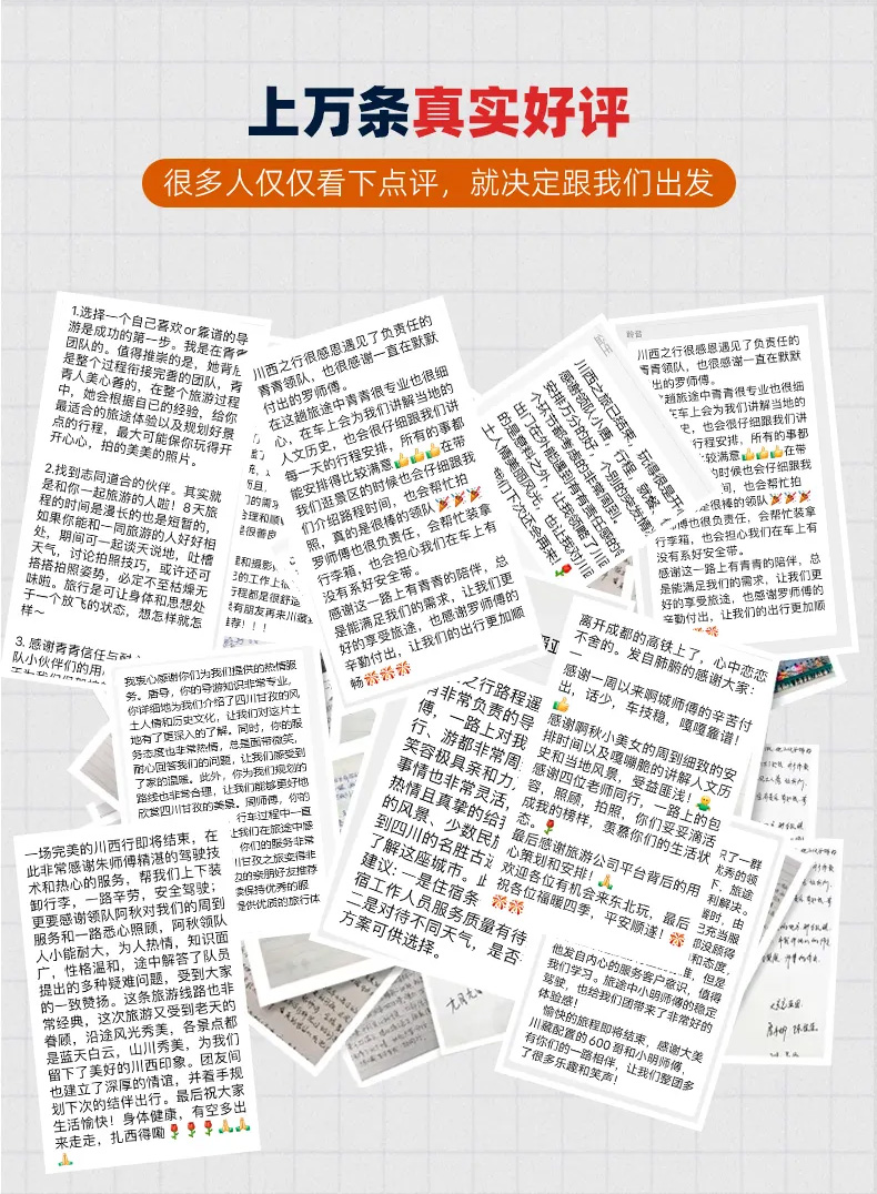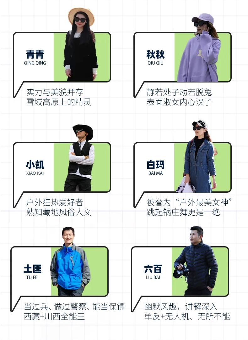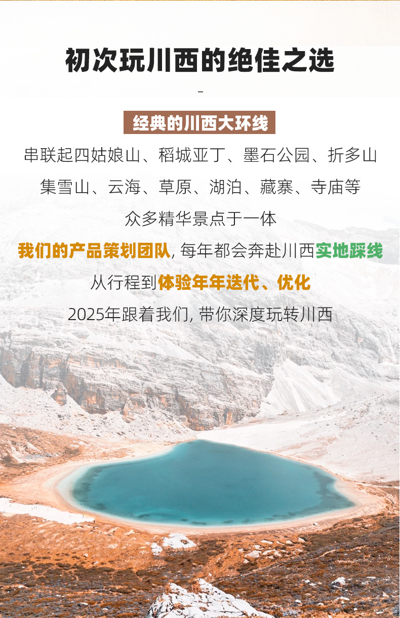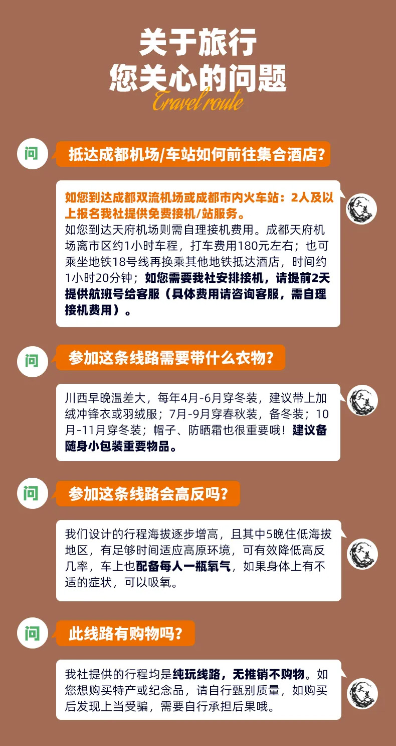 第29期:2025.11.01成都集合-------2025.11.07成都完团 第30期:2025.11.08成都集合-------2025.11.14成都完团 第31期:2025.11.15成都集合-------2025.11.21成都完团 第29期至第31期-【经典版 · 驻地旅拍】3280元/人,单房差800元/人。 活动有自费项,注意查看费用不含 线路纯玩,不安排购物点 【旅拍版 · 全程跟拍说明】 1、团期中标注“【旅拍版 · 全程跟拍】”字样的,是我们产品宣发图拍摄的团期,此类团期15人即升级摄影师+领队双人服务,所拍摄的照片、视频等素材将会用于我们后续的宣发。选择报名这条路线的小伙伴,说不定会成为我们“产品代言人”哦!完团后赠10张简修+底片全送(电子版),如最终成团人数未达到15人,则按常规团价格执行。 2、选择此特殊团期的队员需要签署一份“肖像权许可使用协议”,同意我们后续使用可能有你出镜的图片、视频等,用作网页、微信等推广途径。当然,如果你介意的话,我们也非常理解,你可以选择此路线其他常规团期即可。 |