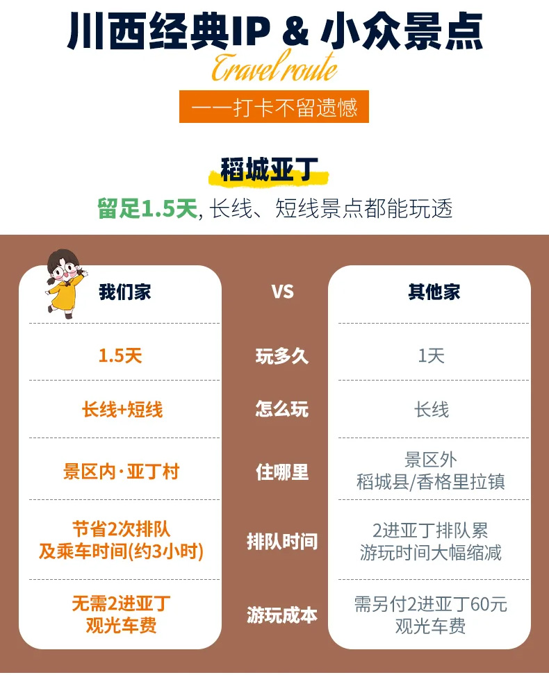 1、交通:根据人数确定车辆,15人即升级保姆车(已含驾驶员食宿); 2、住宿:全程6晚住宿(含集合日1晚赠送4钻酒店、不住不退); 3、门票:四姑娘山双桥沟门票、甲居藏寨门票、墨石公园门票、稻城亚丁门票、勒通古镇门票及观光车、降布神山观景台清洁费及转运费; 4、领队:优秀纯玩领队服务(1-5人司机兼向导,6人及以上配专职领队,已含领队食宿门票); 5、旅拍: (1)经典版·驻地旅拍:免费提供藏装/首饰/头饰,赠3张电子版简修,底片全送; (2)旅拍版·全程跟拍:15人及以上安排摄影师,赠10张简修+底片全送(电子版); 6、随团配备:急救包+血氧仪+温度计,随时观察了解客人的身体状况; |