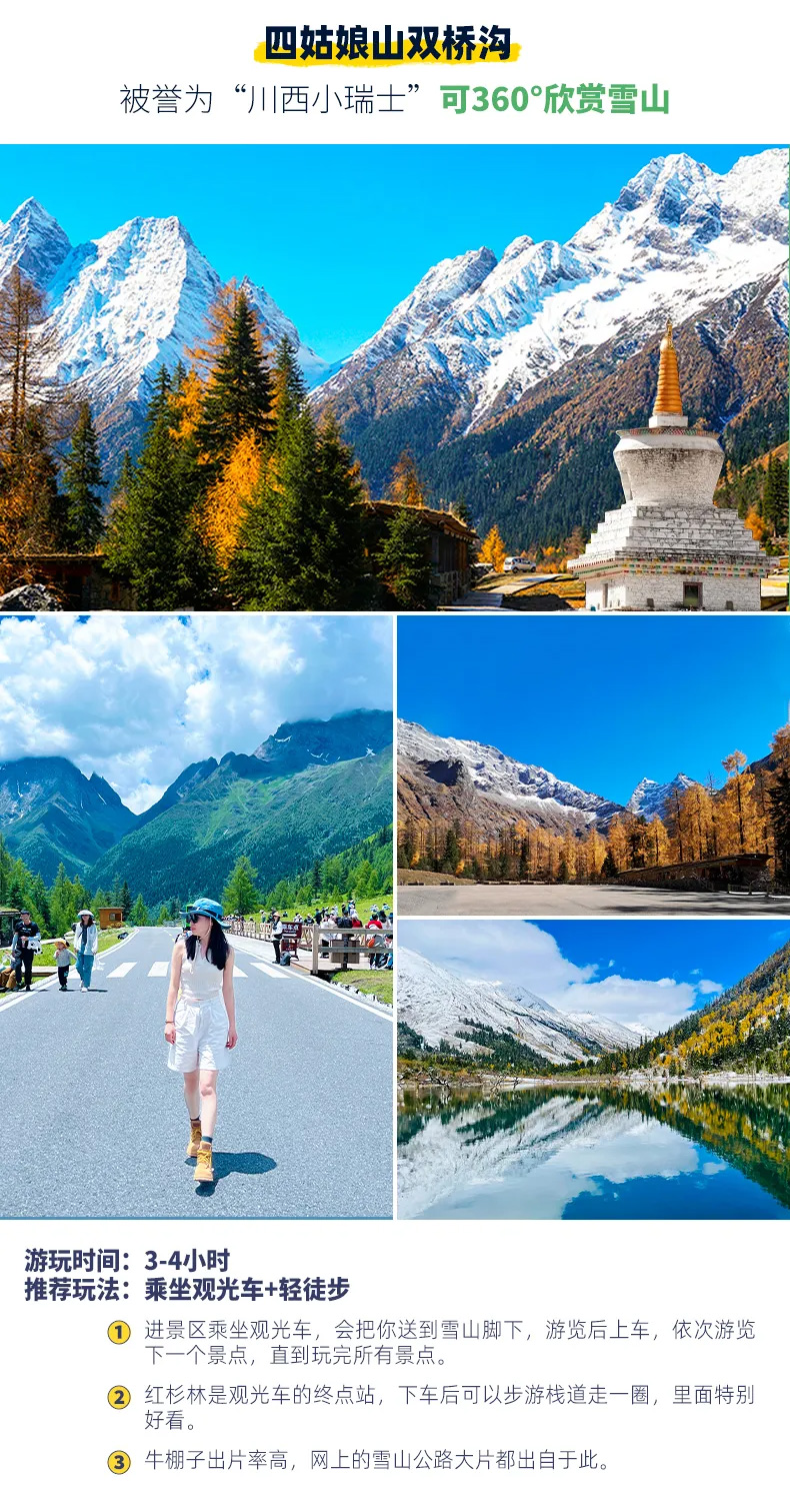 D2 | 第2天,成都-猫鼻梁观景台-四姑娘山双桥沟-甲居藏寨 | |