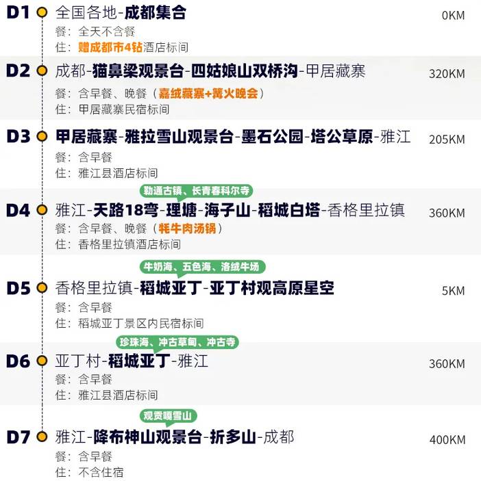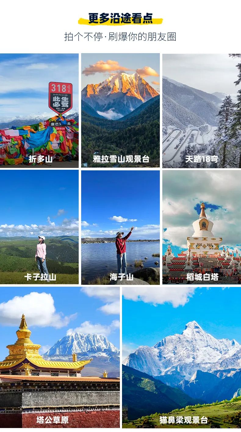 早餐后从雅江出发,穿过高尔寺山遂道,便来到了令人神往的“摄影天堂”【新都桥】, 这里仿若一片如诗如画的世外桃源,神奇的光线,无垠的草原,弯弯的小溪, 山峦连绵起伏,藏寨散落其间,牛羊安详地吃草…… 川西平原风光在此美丽地绽放。 而后换车前往一处比鱼子西更小众、距离贡嘎雪山更近的观景台——【降布神山观景台】, 天气好时,可以同时看见【贡嘎群峰】、【雅拉雪山】、【青绕神山】全貌, 在这里随手一拍,皆是大片!山顶的秋千、经幡长廊更是网红拍照打卡地。 游玩后越过【折多山】, 在这里您可以观赏到【川藏第一关祈愿墙】(网红打卡点), 上面摆放着“扎西德勒、一路顺风、吉祥如意”等字样的祈愿石。 打卡后继续朝着甘孜藏族自治州首府——《康定情歌》中的康定行进, 随后上【雅康高速】, 穿越二郎山隧道,感受阴阳两重天, 经雨城雅安上成雅高速返回成都。 特别提醒: (1)如遇暴雨、路损等不可抗力降布神山观景台不开放,我们将放弃游览,请知悉; (2)如因交通管制、堵车等,G318(折多山)无法通行,我们将改走S434机场路(红海子)方向; (3)以上行程时间安排可能会因天气、路况等原因做相应调整,正常情况下完团回到成都的时间为晚上17:00-18:00,散团点距离成都双流机场约30分钟车程,距离天府机场约1小时车程,建议预订次日离开成都的大交通,如果必须当日离开,请定21:00以后起飞的回程大交通,以免耽误行程; (4)以上行程及时间仅供参考,具体以实际出发行程及时间为准,在不减少景点的情况下,我公司有权调整行程游览的先后顺序。 |