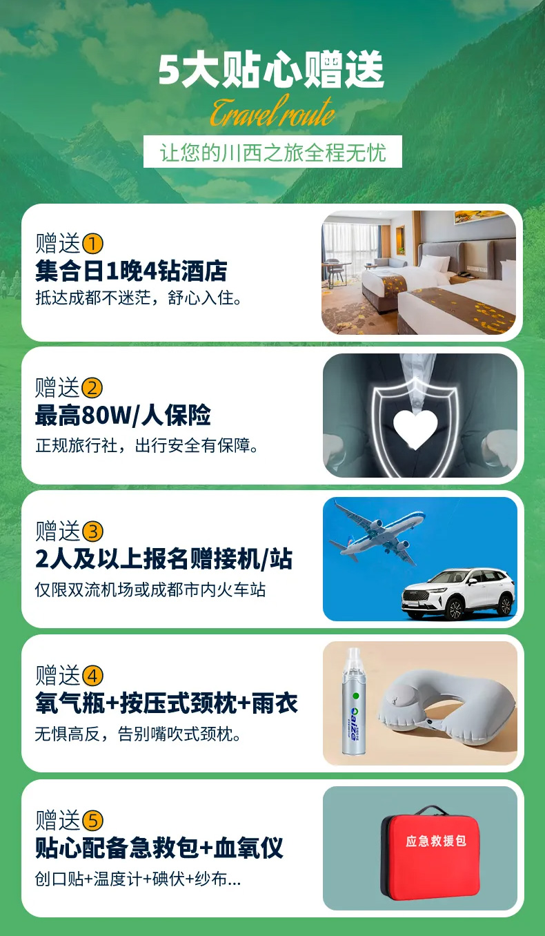 1、藏地人文体验:挂经幡、撒隆达、献哈达、喝酥油茶、围着篝火跳锅庄(8人及以上安排); 2、用餐:全程6个早餐+2个特色餐(嘉绒藏餐+牦牛肉汤锅),如队员另外点餐,需自己支付费用; 3、2人及以上报名赠双流机场接机/成都市内火车站接站(天府机场接机需自理费用); 4、最高保额为80万元的旅游意外险(不含财产险),中国银保监会规定:不满10周岁80万的额度下降至20万,已满10周岁但未满18周岁80万的额度下降至50万; 注:旅行社赠送一份旅游意外保险,如发生意外事件,该意外保险理赔的金额优先抵扣旅行社可能承担的赔偿金额。港澳台及外籍人士,仅限大陆三甲医院就医才可报销,如离开大陆就医不予报销。 5、颈枕+两件式套装雨披+瓶装氧气,每人一套; 注:接机/站请提前2天告知航班号/车次,否则视为放弃此服务;赠送项目如客人自愿放弃或因特殊原因及不可抗力等原因无法参加,均不退费用,也不等价交换。 |