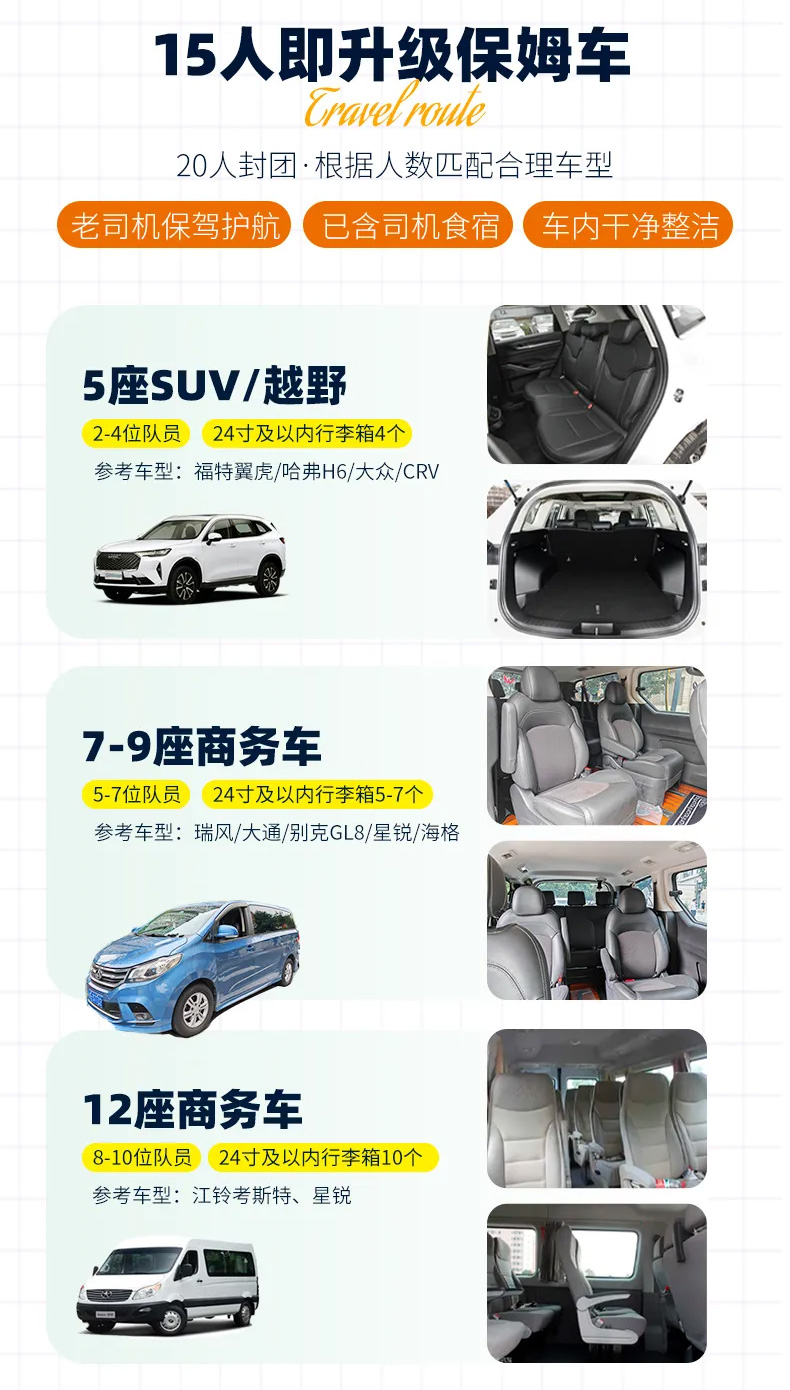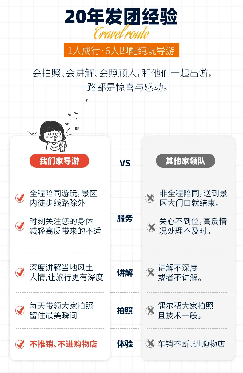 成团 | 1人成行,1-5人司机兼向导,6人及以上配专职领队,20人封队 | |