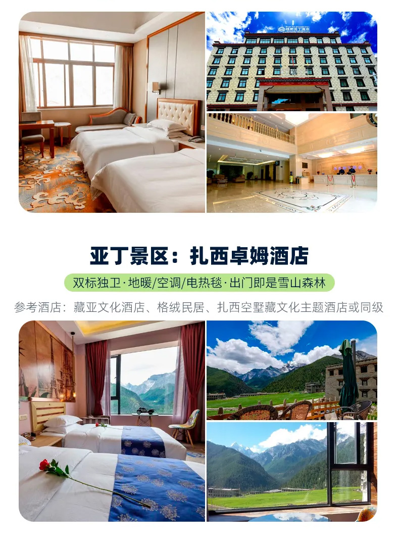 早餐后乘车前往令人神往的【稻城亚丁风景区】, 随后在亚丁风景区游客接待中心, 换乘景区观光车前往亚丁村(景区观光车120元/人,费用自理,必须乘坐)。 沿途可以欣赏【仙乃日】神山(意为观世音菩萨)风光,大约40分钟, 抵达亚丁村住宿的客栈, 把行李放在景区亚丁村的住宿点后再乘坐景区摆渡车约20分钟车程到达扎灌崩, 徒步约500米抵达冲古服务区,观赏【冲古寺】风光及仙乃日神山风光, 然后可自费乘坐景区游览车(自理费用:游览车往返70元/人,约20分钟单程,费用自理,建议乘坐), 继续前往【洛绒牛场】,可尽情观赏【夏诺多吉】神山(意为金刚手菩萨), 【央迈勇】神山(意为文殊菩萨),观赏野生动物、高山花卉、雪山、森林、冰川、湖泊、河流,体验人和自然和谐相处的天然妙趣, 游玩之后原路返回至亚丁村住宿, 如果天气晴朗,晚上便可欣赏到浩瀚的【高原星空】。 特别提醒: (1)今天换乘观光车前往亚丁景区,车子和驾驶员不能随队员进入亚丁景区,晚上需要在亚丁村住宿一晚,亚丁景区气候变化不定,建议队员把拉杆箱放在车上,带小背包(放必要的洗漱用品、保暖衣物、贵重物品、雨具等)进入景区; (2)亚丁村的住宿比较艰苦、条件非常落后,均为民居改建的游客接待点,请您做好相应心理准备,并理解这份纯朴原始的“真、善、美”,季节性停水停电,不可避免,请提前准备手电; (3)亚丁风景区内专门经营的饭店比较少,队员们可以在住宿点或景区内洛绒牛场餐厅用餐,但由于景区内所有的生活物资都需要从外面运进来,所以还是需要提前做充足的准备。国庆金秋期间可能会出现堵车或景区内排队等候时间较长的情况,到达用餐点的时间较晚,建议自备一些零食、巧克力以便充饥; (4)冲古寺~洛绒牛场:共设起点站(冲古寺站)、1号站(千佛山站)、2号站(圣水湖站)、3号站(央迈勇站)和终点站(洛绒牛场站)五个站点,游览车往返票70元/人,单程票40元/人,区间票每站10元(可选择徒步,客人自愿自主消费); (5)免责声明:五色海、牛奶海,此两景点非旅行社正常行程包含,如需游览则费用与安全自理,风险自己承担; (6)从洛绒牛场到牛奶海、五色海有两种方式,一种是步行走马道上去,往返需要5-6个小时,往返10公里;一种是骑马上去,上行3个小时(马费单程自理300元/人,从洛绒牛场—马帮运营终点站全程3.5公里),骑马需注意安全,必须由马夫牵方能骑,从马帮运营终点站通往牛奶海4600M、五色海4700M为1.8M的徒步路段,较为崎岖,对游客体力具有较高的要求,同时海拔高处气温较低,山风较大,需备足衣服; (7)当天游览线路参考:游客中心~景区观光车~亚丁村~景区摆渡车/观光车3.4km~扎灌崩~徒步0.5km~冲古寺~游览车6.7km~洛绒牛场(三怙主雪山)~骑马/徒步3.5km~马帮运营终点站~徒步牛奶海、五色海~原路返回亚丁村; (8)关于稻城亚丁景区限流:为避免人流高峰聚集,稻城亚丁景区最大承载量为16850人,其中牛奶海、五色海区域游客承载量为3900人,我们将提前为您预约门票,如因旺季预约人数过多,不能游览牛奶海、五色海,我们将根据实际情况调整游览路线。 |