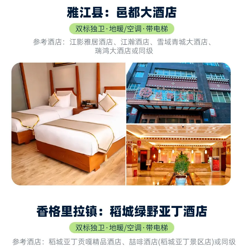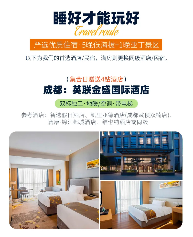 全国各地的小伙伴抵达成都,入住我社为您安排的酒店。 今天是集合日,您可以放下行李后在酒店好好休息一下,也可以去品尝一下各种美食。 上午抵达成都的小伙伴,可以逛一逛成都的时尚中心【春熙路】和千年古刹【大慈寺】,打卡中西合璧的【太古里】和【IFS翻墙熊猫】。 下午抵达成都的小伙伴,可以去【锦里】和【宽窄巷子】, 感受最悠闲惬意的蓉城慢生活,或者是去打卡赵雷《成都》里的【小酒馆】。 特别提醒: (1)集合日为自由活动,不是正式的行程,请在自由活动时注意人身财产安全,集合日不含保险; (2)到集合酒店报“大美稻亚+姓名”拿房,房费已付,押金自付。入住酒店的时间一般在集合日当天的14点以后,如果您提前到达且酒店房间未整理出来无法办理入住,可将行李暂时寄存在前台,先在市区周边自由游玩; (3)领队或驾驶员会在集合日21:00之前,通知队员次日的出发时间,如果21:00尚未接到领队或者驾驶员的通知,请联系客服确认; (4)建议队员们在集合日抵达成都后,可在市区采购一些旅行用品,如零食、佐餐小菜、药品等。 |