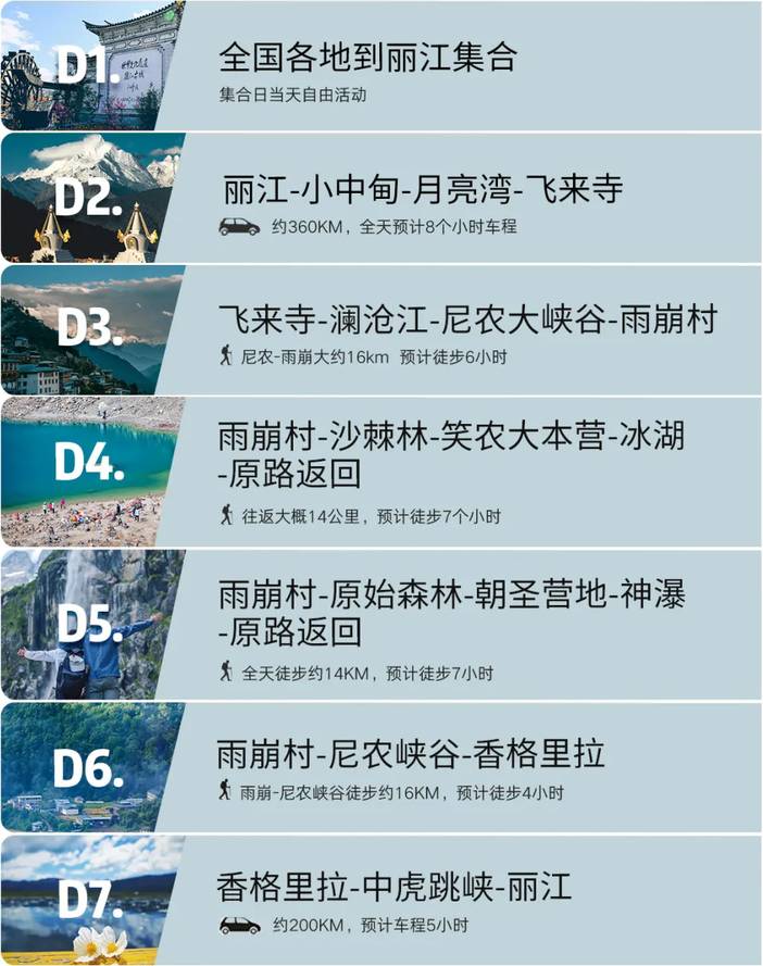1、不同于传统旅游团,本活动属于户外旅行活动,行程中无强制购物、无保姆式服务,要求小伙伴们有较好的友爱互助精神; 2、接送说明:出发集合点通常为赠送的集合酒店,出发参考时间通常为7:00,行程结束返回点相同,具体时间地点请以向导通知为准; 3、工作人员会在集合日前2-5天把参加同一期活动的小伙伴拉进活动微信群,大家可以提前交流,互相熟悉; 4、个人财物:乘车、住宿及旅行中个人财产请自行妥善保管,若有遗失、损坏均自行承担; 5、保险说明:旅行社提前代购旅游组合保险; 6、风险说明:高原地区由于途中车辆负荷大,可能会遇到抛锚并影响行程的情况,请游客做好心理准备。如途中遇特殊天气状况、景区政策调整等人力不可抗拒的因素(不可抗力包括但不仅限于:旅行途中发生修路、塌方、道路维修、火灾、地震、洪水等自然灾害,交通工具停运,国家政策或政府行为限制,目的地突发暴动或传染病等社会异常事件)造成的团队行程更改,则退还未去景点门票或根据实际情况更改线路安排,超支费用由游客自理。由于客人原因旅游期间未用车、房费用概不退还;年龄超60岁签订免责协议,且需家人朋友陪同进行活动,单独老年人参团请提前告知; 7、因旅行社的原因导致活动无法成行,我们会联系您协商调整出行日期或改签活动,如无法调整我们将为您全额退还已交费用,并承担因活动取消引起的机票/火车票的退票或同等舱位的改签费用(改签费用的上限不高于退票费); 8、优惠政策:持有有效的军官证、学生证、残疾证等国家规定能减免门票的,请随身携带好相关证件,进入景区前由景区工作人员核验真实性(符合减免标准则由向导按照公司采购折扣价标准给予退还,门票优惠均不以挂牌价为准),优惠价以景区政策为准,活动结束由旅行社统一退还差价(团体折扣价减证件优惠价); 9、客观条件:本线路沿途经济水平较为落后,整体条件较差,例如飞来寺、雨崩村住宿条件较差,且停水、停电时有发生,阴天常无热水无法洗澡,请参与者提前做好心理准备; 10、赠送说明:本行程免费赠送集合日丽江住宿(部分日期除外,详见费用说明处) 、提供雨衣登山杖证书奖牌各1份,不使用则无费用退还; 11、游玩说明:以上行程在不改变参观内容及景点的条件下,旅行社有权作前后调整,藏区属于未被开发地区,很多景点有特殊性,如果想去标准行程中没有注明的景点,产生的安全与费用等问题与旅行社无任何关系; 12、脱团说明:提前离团需与向导签署离团协议,签署后旅行协议即终止,离队后的一切安全责任和费用均由个人自行承担; 13、杜绝传染性疾病、心血管疾病、脑血管疾病、呼吸系统疾病、精神疾病、高血压、高血糖、高血脂、严重贫血病、大中型手术的恢复期病、孕妇及行动不便者等不适宜剧烈活动的人员参加,出发前请咨询医生和体检。凡隐瞒自己疾病,一切后果自负; 14、旅行社作为活动发起方,拥有旅行活动期间所有照片、视频等素材的使用权。 |