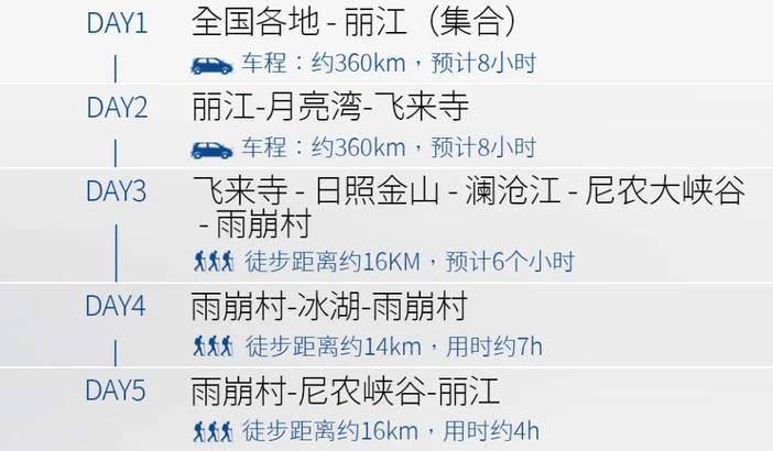 徒步 | ● | 集合日,自由活动 |