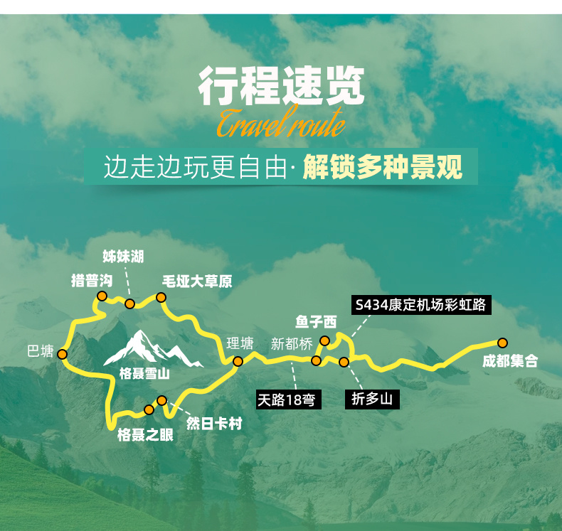 早餐后从雅江出发,穿过高尔寺山遂道, 便来到了令人神往的“摄影天堂”-【新都桥】, 这里仿若一片如诗如画的世外桃源, 神奇的光线,无垠的草原,弯弯的小溪,山峦连绵起伏, 藏寨散落其间,牛羊安详地吃草…… 川西平原风光在此美丽地绽放。 沿着G318继续前进,之后越过【折多山】, 在这里您可以观赏到【川藏第一关祈愿墙】(网红打卡点), 上面摆放着“扎西德勒、一路顺风、吉祥如意”等字样的祈愿石。 打卡后继续朝着甘孜藏族自治州首府——《康定情歌》中的康定行进, 随后上【雅康高速】,穿越二郎山隧道,感受阴阳两重天, 经雨城雅安上成雅高速返回成都。 特别提醒: (1)如因交通管制、堵车等,G318(折多山)无法通行,我们将改走S434机场路(红海子)方向; (2)以上行程时间安排可能会因天气、路况等原因做相应调整,正常情况下完团回到成都的时间为晚上17:00-18:00,散团点距离成都双流机场约30分钟车程,距离天府机场约1小时车程,建议预订次日离开成都的大交通,如果必须当日离开,请定21:00以后起飞的回程大交通,以免耽误行程; (3)以上行程及时间仅供参考,具体以实际出发行程及时间为准,在不减少景点的情况下,我公司有权调整行程游览的先后顺序。 |