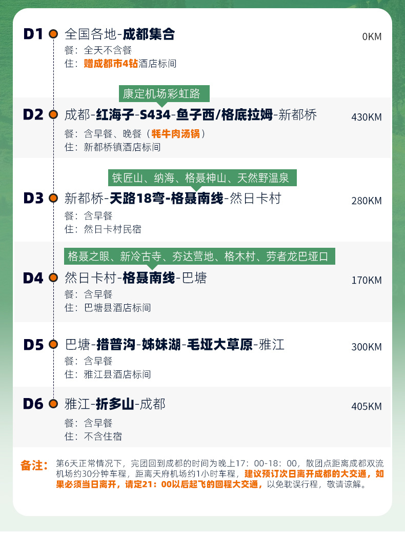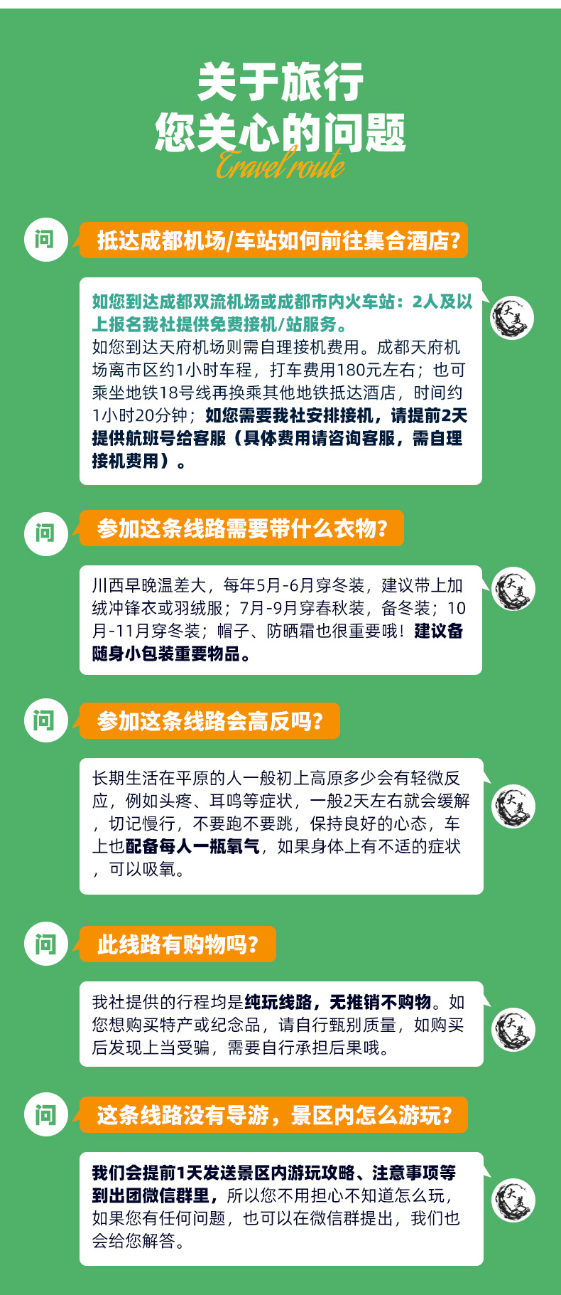 1、交通:不含广州(或各地)往返成都的大交通; 2、用餐:全程午餐、晚餐(第2天晚餐:牦牛肉汤锅除外)均不含,需自理(其余早餐为赠送,不用不退),大家可以一起AA,也可以单独用餐,无需支付工作人员的用餐费; 3、单房差:报价均按2人入住1间房核算,如出现单男单女,尽量安排该客人与其他同性别团友拼房,如不愿拼房(请在报名时告知客服)或未能拼房,请补齐单房差,如果在集合日或行程进行中选择单独住一间房,则需补一间房的费用(单房差*2)。出团时间不同,单房差价格不同,具体价格请参看【活动批次】,或者直接咨询客服; 4、景区门票交通: 格聂三宝门票30元/人(可选), 措普沟景区光车90元/人(必须), 鱼子西、红海子等清洁费10-30元/人暂未收取,如产生需自理。 5、其他:不含各种个人开支; 6、不可抗力:如果因为人力不可抗拒因素(如塌方、泥石流、路桥被毁、航班延误、国家政策、战争、瘟疫、交通管制、堵车等)导致不能履行合同和旅程变化,我社不承担相关赔偿。 |