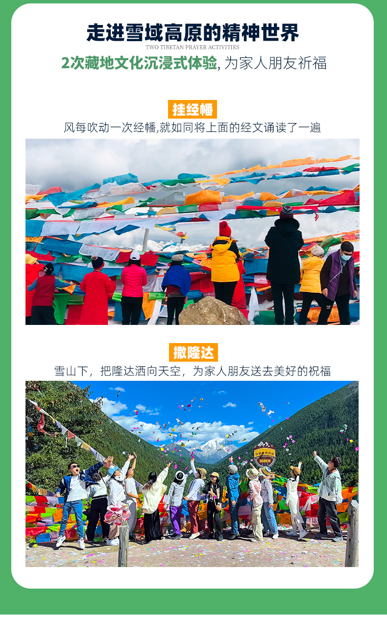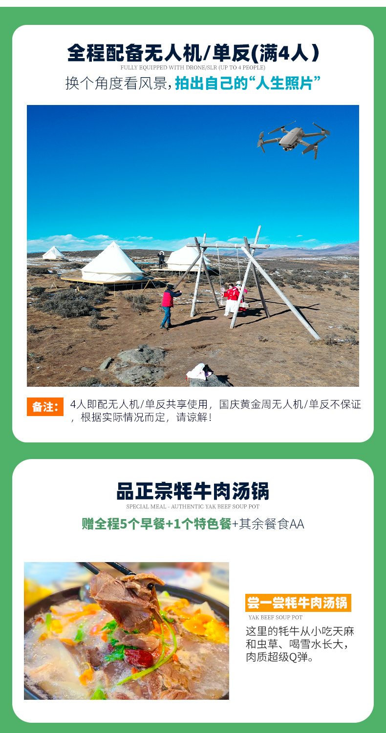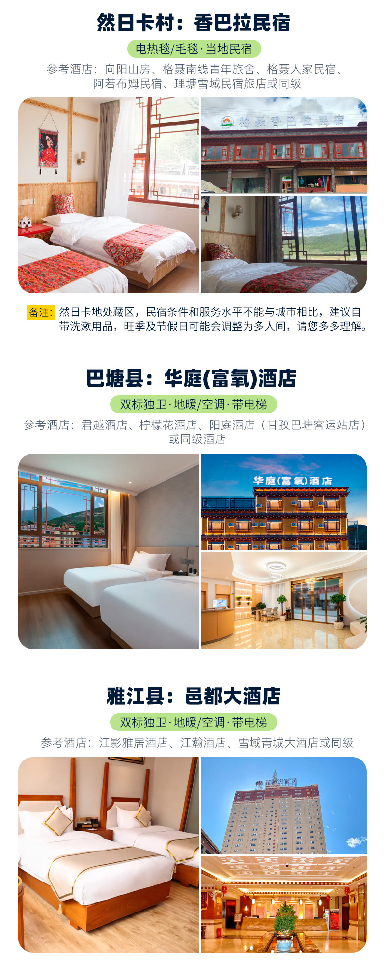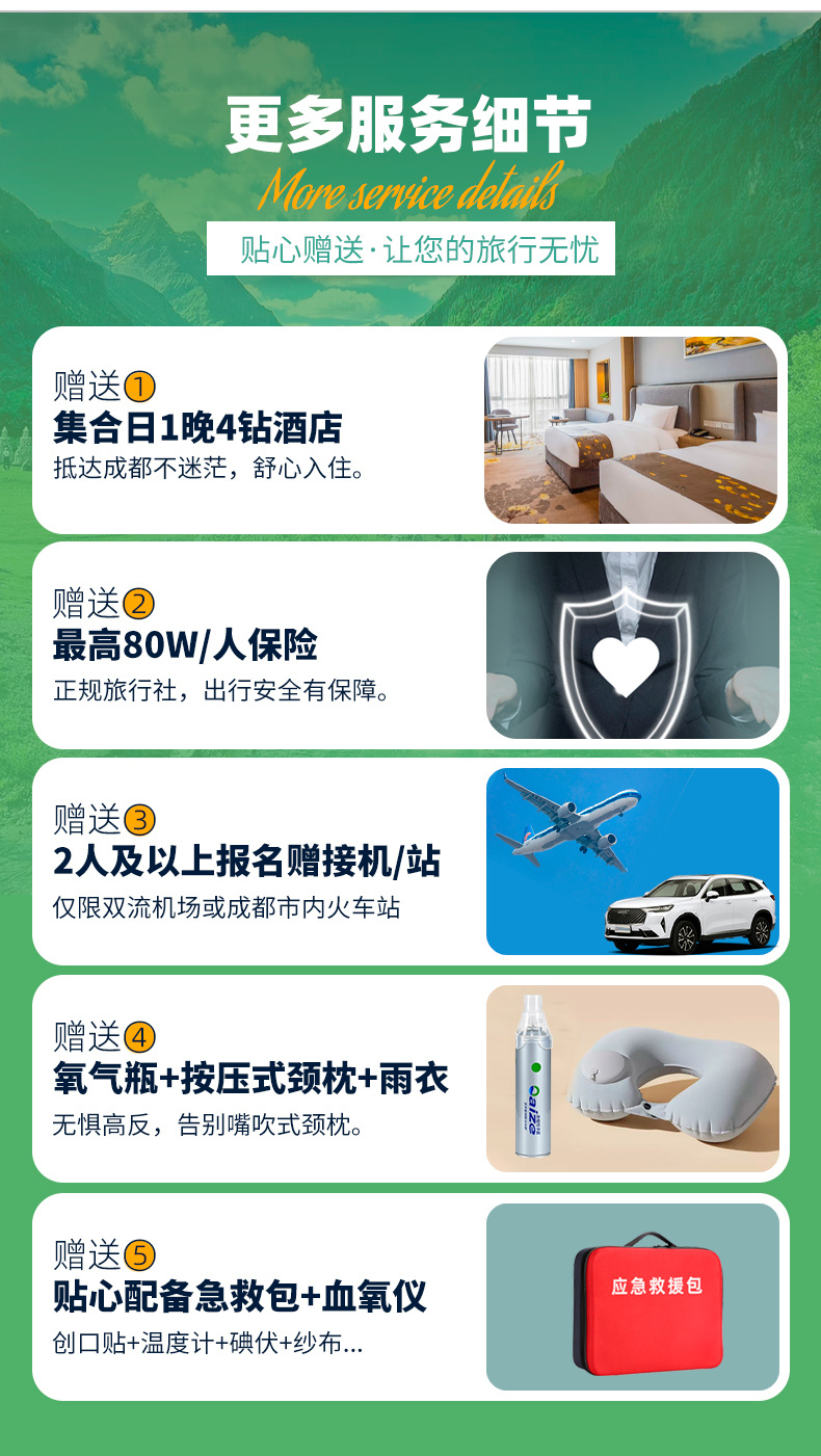 1、交通:8人VIP小团,根据人数确定车辆(全程司机兼向导,已含驾驶员食宿、油费、过路费,驾驶员熟悉线路,会给队员提供行程建议,边走边玩,保证多次停车服务,但不会像专业导游一样解说,且不陪同队员进景区,请理解); 2-4位队员乘坐5座SUV/越野; 5-6位队员乘坐7座商务车; 7-8位队员升级9座保姆车; 2、住宿:4晚酒店标间+1晚藏家民宿(含集合日赠送1晚4钻酒店、不住不退); 3、门票:措普沟门票; 4、赠送: (1)藏地人文体验:挂经幡、撒隆达; (2)用餐:全程5个早餐+1个特色餐(牦牛肉汤锅),如队员另外点餐,需自己支付费用; (3)野温泉体验; (4)2人及以上报名赠双流机场接机/成都市内火车站接站(天府机场接机需自理费用); (5)最高保额为80万元的旅游意外险(不含财产险),中国银保监会规定:不满10周岁80万的额度下降至20万,已满10周岁但未满18周岁80万的额度下降至50万; (6)颈枕+两件式套装雨披+瓶装氧气,每人一套; 注:港澳台人士,仅限大陆三甲医院就医才可报销,如离开大陆就医不予报销。接机/站请提前2天告知航班号/车次,否则视为放弃此服务;赠送项目如客人自愿放弃或因特殊原因及不可抗力等原因无法参加,均不退费用,也不等价交换。 5、随团配备: (1)4人即配无人机/单反(国庆期间不保证,视情况而定); (2)急救包+血氧仪+温度计,随时观察了解客人的身体状况。 |