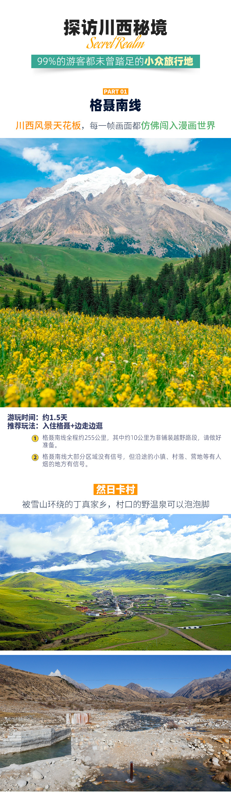 早餐后离开然日卡村,行驶约20多分钟,便抵达【格聂之眼】, 一个直径约几十米的海子, 从高空往下看好像巨眼一样,清澈明亮, 最为神奇的是,格聂之眼这个海子里,长了一圈的水草,正好围成了一圈像瞳孔一样,因此得名格聂之眼。 格聂之眼是观赏格聂南坡和格聂群峰的最佳位置之一, 格聂神山、肖扎神山、克麦隆神山等尽收眼底。 而后继续向西行驶约20分钟,来到一个分岔路口, 沿着右侧的土路行车约10分钟,便抵达位于格聂神山山脚的【新冷古寺】, 寺内藏着【格聂三宝】: 母鹿角、反转海螺以及一块自然形成的似血管纹路的被喻为“格聂之心”的白色奇石。 游览后返回主路继续西行,随后便来到了【夯达营地】, 这里一面是辽阔的大草原、夏季满山野花,一面是格聂神山,常年闪耀着圣洁的光。 而后沿着河谷一直逆流而上,来到一个与世隔绝的山谷牧村-【格木村】, 这里无人打扰,有着鲜花四溢的草甸、零零散散的木屋、郁郁葱葱的松树林, 牦牛马儿悠闲吃草,各色鲜花争相开放, 你可以静静地私享这一大片景观。 而后翻越【劳者龙巴垭口】,这里能直接欣赏到完整的热梯河谷,也是拍摄格聂南线公路的好机位。 继续行驶到巴塘县入住。 特别提醒: 部分路段路况较差,劳者龙巴垭口海拔高,如有晕车情况建议提前准备晕车贴/晕车药。 |