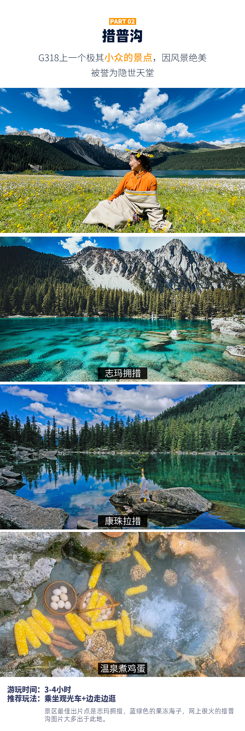 早餐后前往世界的【措普沟】——G318最美遇见, 这里浓缩了高原的美景,雪山、草原、森林、湖泊、寺庙皆有。 随后在游客中心换乘景区观光车(90元/人,费用自理,必须乘坐), 首先我们会经过【亚索寺】,它属于藏传佛教中的宁玛派寺院,在深山绿水间,红色的建筑格外亮眼;接着来到【热坑温泉群】, 这里是享有四川地热资源之冠美誉的茶洛热坑温泉群,在长约1.5公里,宽约300米的范围内,集中分布了150余个气热泉和热喷泉口,温度高达85℃以上,因此10分钟左右就可以享用美味的温泉煮鸡蛋; 下一站便是【章德草原】, 曾被《中国国家地理杂志》誉为川西最美的高寒草原,极目所至,远处便是雄伟的扎金甲博神山;随后来到康巴第一圣湖——【措普湖】, 湖面波光粼粼,夏天湖边开满五颜六色的野花,定会让你流连忘返;最后打卡【措普寺】、【康珠拉措】和【志玛拥措】, 这对如绿松石般翠绿的姊妹湖您一定不要错过,她们俩可是措普沟的颜值担当。 在景区游玩期间,如果您有幸运的话,还能遇见可爱的土拨鼠,与它们亲密互动,感受感受人与自然的高度和谐。 下午途径海子山上的【姊妹湖】,两处碧蓝澄澈的的高原湖泊紧紧相依,在一呼一吸之间,散发着让人沉醉的恬美,在荒凉山原上,如天堂宝石般镶嵌其中,亦如神之悲悯化作眼泪滴落凡间,纯净无暇,盈盈可亲。 随后一边聆听着车内的音乐,一边沿途欣赏着【毛垭大草原】的风光,每年6-8月份,是最美丽的时节,一望无边的草原上野花盛开,无数牛羊散落其间,邦锦美朵、格桑花以及各种不知名的小花璀璨盛开,畅游在一个花的世界。 经理塘后继续沿G318行进,抵达雅江县入住。 |
