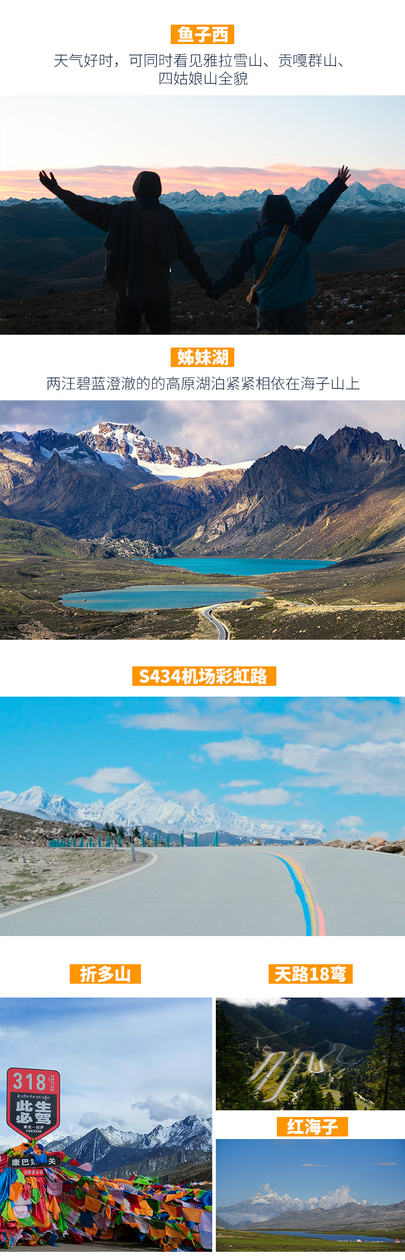 早晨乘车从成都出发, 经闻名天下的"雨城"雅安,上雅康高速, 穿越【二郎山隧道】,感受阴阳两重天, 下高速便抵达甘孜藏族自治州首府——《康定情歌》中的康定。 继续行车,拐进绝美的S434, 这条路人少、景美,一路都是惊喜,蓝天、雪山、海子尽收眼底。 而后抵达一处秘境海子——【红海子(加呷腊)】, 这里可以包揽整个湖泊和雪山。 晴天,可以看到笔架山(5880M)、田海子峰(6080M)等一众雪山, 拍照更是一绝,海子和雪山遥相呼应,怎么拍都好看。 途中还会经过各大旅行博主的拍照圣地【康定机场彩虹公路】, 这里背靠雅拉雪山,遥望贡嘎群山,分分钟拍出雪山公路大片,惊艳朋友圈。 拍摄完毕后前往【鱼子西(曲莫贡)】, 这个近年来非常火爆的360°天然雪山观景台, 天气好时,可以同时看见【雅拉雪山】、【贡嘎群山】、【四姑娘山】全貌, 在这里随手一拍,皆是大片! 山顶的秋千、露营的帐篷更是网红拍照打卡地, 如果有幸遇见日落时分的绝美夕阳,那将是终生难忘的记忆! 随后前往新都桥入住。 特别提醒: (1)建议上高原前2天,不要洗澡,以免感冒引起高原反应,会影响整个行程,如果有一定的忍耐力,建议多忍耐几天,确定自己已经适应高原再洗澡; (2)藏区水电供应不足,偶尔停水停电,请自备湿巾以及手电筒,可能会出现洗澡水水温不稳定,或者在洗澡过程当中停水的现象,所以洗澡的速度要快,最好是完全适应藏区后再洗澡; (3)如遇鱼子西景点关闭,无法游览,我们将更换为格底拉姆/八郎生都,请知悉!如因天气、交通管制、堵车等原因,赶不上鱼子西的日落,敬请见谅。 |