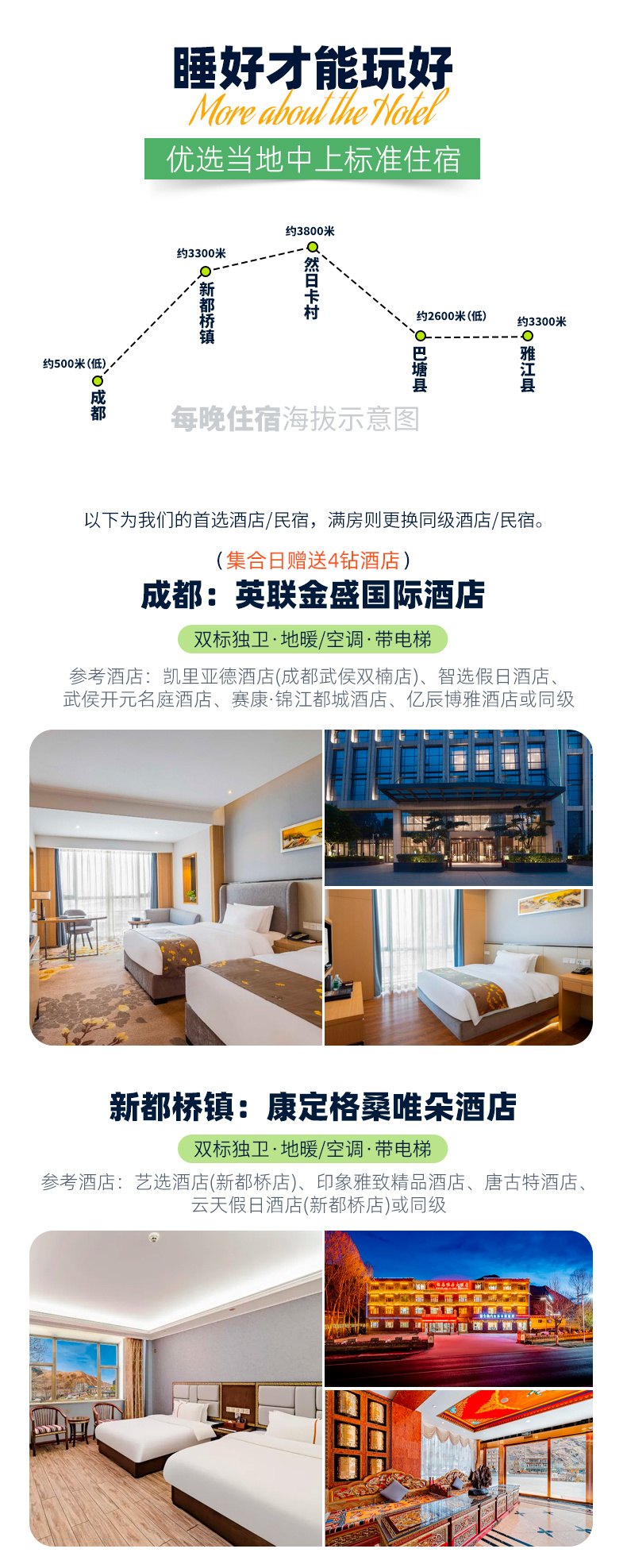 全国各地的小伙伴抵达成都,入住我社为您安排的酒店。 今天是集合日,您可以放下行李后在酒店好好休息一下,也可以去品尝一下各种美食。 上午抵达成都的小伙伴,可以逛一逛成都的时尚中心【春熙路】和千年古刹【大慈寺】,打卡中西合璧的【太古里】和【IFS翻墙熊猫】。 下午抵达成都的小伙伴,可以去【锦里】和【宽窄巷子】, 感受最悠闲惬意的蓉城慢生活,或者是去打卡赵雷《成都》里的【小酒馆】。 特别提醒: (1)集合日为自由活动,不是正式的行程,请在自由活动时注意人身财产安全,集合日不含保险; (2)到集合酒店报“大美格聂+姓名”拿房,房费已付,押金自付。入住酒店的时间一般在集合日当天的14点以后,如果您提前到达且酒店房间未整理出来无法办理入住,可将行李暂时寄存在前台,先在市区周边自由游玩; (3)驾驶员会在集合日21:00之前,通知队员次日的出发时间,如果21:00尚未接到驾驶员的通知,请联系客服确认; (4)建议队员们在集合日抵达成都后,可在市区采购一些旅行用品,如零食、佐餐小菜、药品等。 |