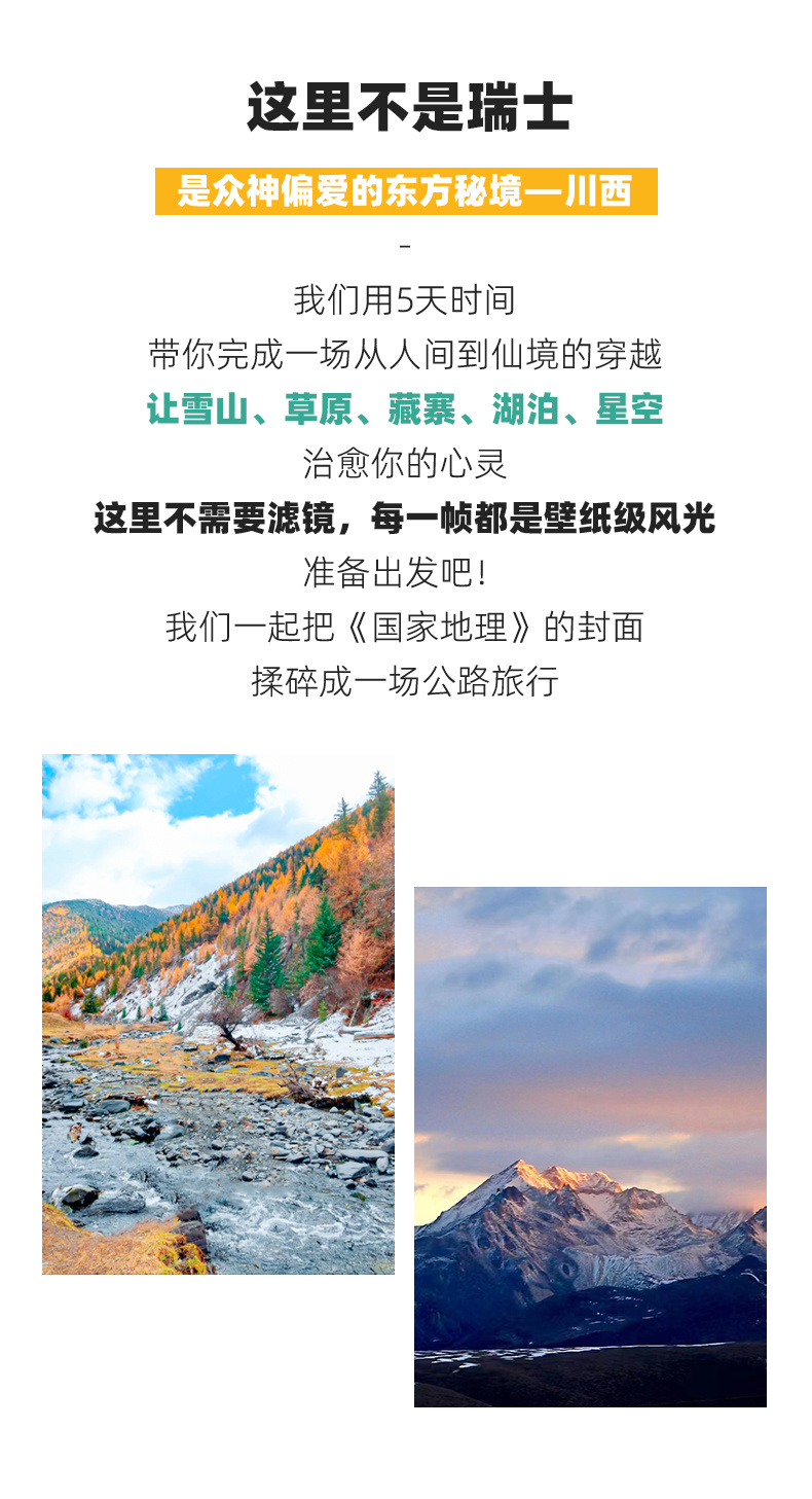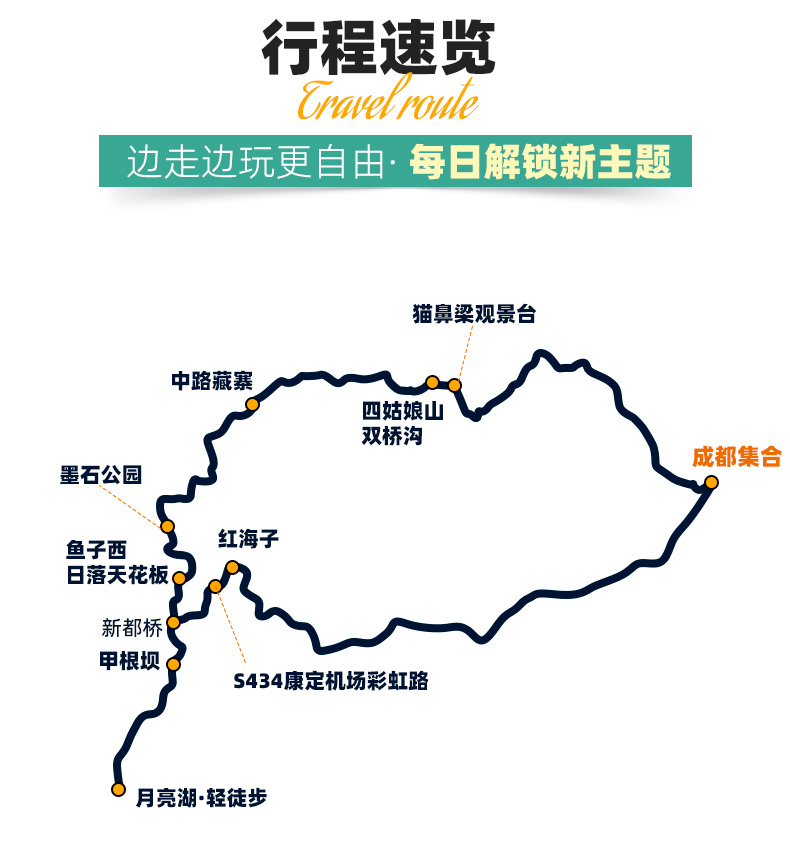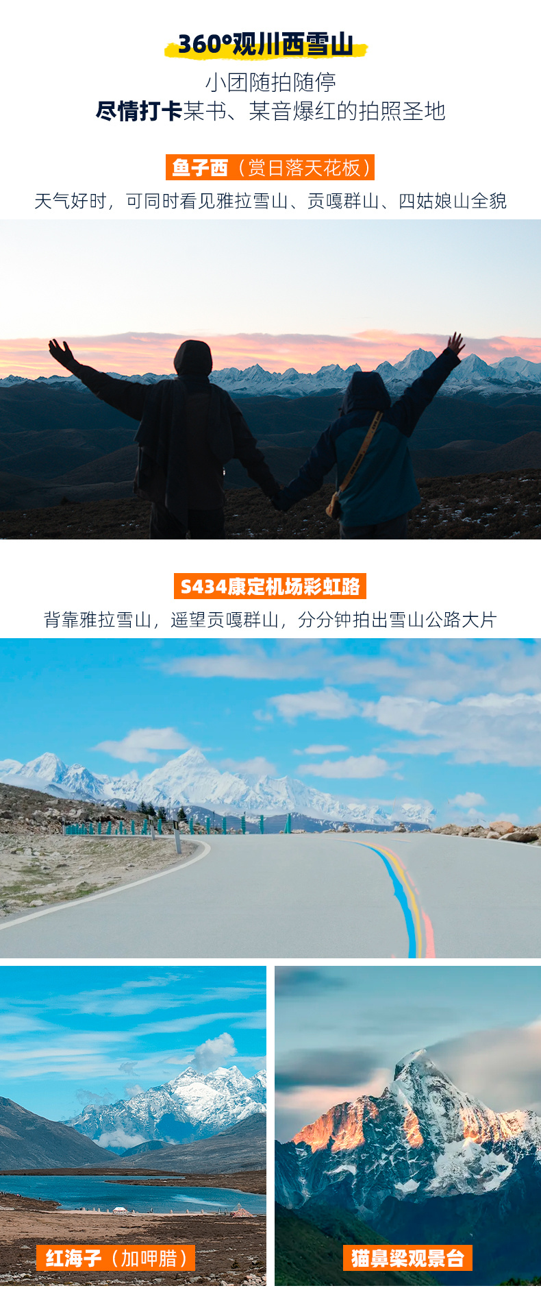 早餐后离开新都桥,我们朝着康定机场的方向出发, 途中经过各大旅行博主的拍照圣地【康定机场彩虹公路】, 这里背靠雅拉雪山,遥望贡嘎群山,分分钟拍出雪山公路大片,惊艳朋友圈。 不一会便拐进一条人少景美的网红公路S434,这条路人少、景美,一路都是惊喜,蓝天、雪山、海子尽收眼底。 继续行车,而后抵达一处秘境海子--【红海子(加呷腊)】,这里可以包揽整个湖泊和雪山。 晴天,可以看到笔架山(5880M)、田海子峰(6080M)等一众雪山, 拍照更是一绝,海子和雪山遥相呼应,怎么拍都好看。 之后抵达甘孜藏族自治州首府--《康定情歌》中的康定, 上高速后穿越【二郎山隧道】,感受阴阳两重天, 经闻名天下的"雨城"雅安,返回到天府之国成都。 特别提醒: (1)以上行程时间安排可能会因天气、路况等原因做相应调整,正常情况下完团回到成都的时间为晚上16:00-17:00,散团点距离成都双流机场约30分钟车程,距离天府机场约1小时车程,建议预订次日离开成都的大交通,如果必须当日离开,请定20:00以后起飞的回程大交通,以免耽误行程; (2)以上行程及时间仅供参考,具体以实际出发行程及时间为准,在不减少景点的情况下,我公司有权调整行程游览的先后顺序。 |