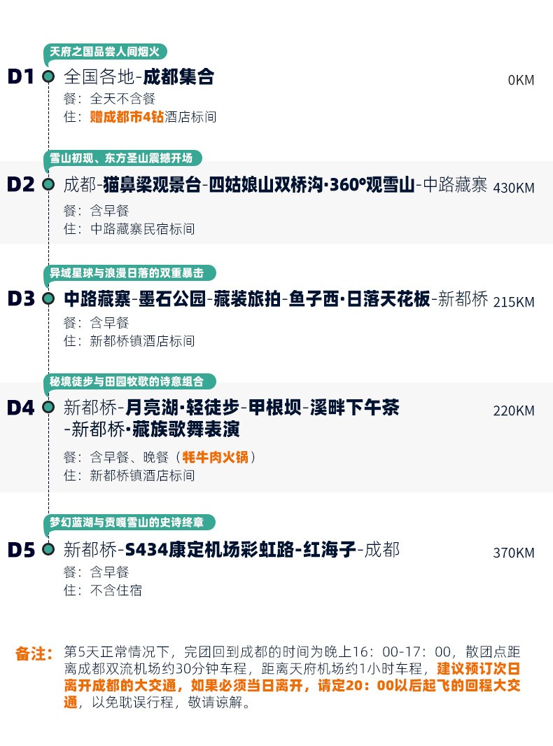 1、交通:不含往返成都的大交通; 2、用餐:全程午餐、晚餐(第4天晚餐:牦牛肉火锅除外)均不含,需自理(其余早餐为赠送,不用不退),大家可以一起AA,也可以单独用餐,工作人员的用餐团费当中已包含,不需另外支付; 3、单房差:报价均按2人入住1间房核算,如出现单男单女,尽量安排该客人与其他同性别团友拼房,如不愿拼房(请在报名时告知客服)或未能拼房,请补齐单房差,如果在集合日或行程进行中选择单独住一间房,则需补一间房的费用(单房差*2)。出团时间不同,单房差价格不同,具体价格请参看【活动批次】,或者直接咨询客服; 4、景区内交通: ★四姑娘山双桥沟观光车70元/人(必须), ★墨石公园观光车20元/人(必须), ★月亮湖摆渡车60元/人(可选)、 ★月亮湖清洁费25元/人(必须), ★鱼子西、红海子等清洁费10-30元/人暂未收取,如产生需自理。 5、其他:不含各种个人开支; 6、发票:报价未含发票; 7、不可抗力:如果因为人力不可抗拒因素(如塌方、泥石流、路桥被毁、航班延误、国家政策、战争、瘟疫、交通管制、堵车等)导致不能履行合同和旅程变化,我社不承担相关赔偿。 |