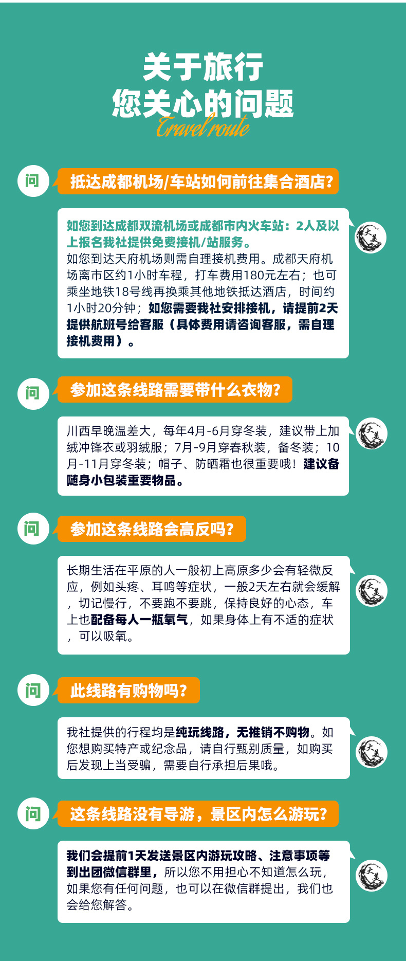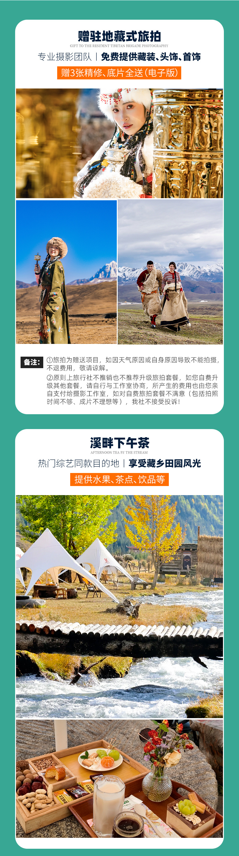 1、驻地藏式旅拍1次:免费提供藏装/首饰/头饰,赠3张电子版简修,底片全送; 2、藏地人文体验:挂经幡、撒隆达、藏族歌舞表演(6人及以上赠送); 3、溪畔下午茶:提供水果、茶点、饮品等; 4、用餐:全程4个早餐+1个特色餐(牦牛肉火锅),如队员另外点餐,需自己支付费用; 5、2人及以上报名赠双流机场接机/成都市内火车站接站(天府机场接机需自理费用); 6、最高保额为80万元的旅游意外险(不含财产险),中国银保监会规定:对于71周岁以上(含71周岁)的被保险人,保额减半,保费不变;不满10周岁80万的额度下降至20万,已满10周岁但未满18周岁80万的额度下降至50万; 注:旅行社赠送一份旅游意外保险,如发生意外事件,该意外保险理赔的金额优先抵扣旅行社可能承担的赔偿金额。港澳台及外籍人士,仅限大陆三甲医院就医才可报销,如离开大陆就医不予报销。 7、颈枕+两件式套装雨披+瓶装氧气,每人一套; 注:接机/站请提前2天告知航班号/车次,否则视为放弃此服务;赠送项目如客人自愿放弃或因特殊原因及不可抗力等原因无法参加,均不退费用,也不等价交换。 |