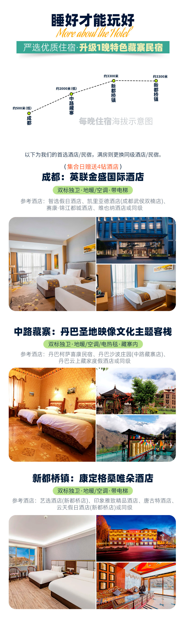 全国各地的小伙伴抵达成都,入住我社为您安排的酒店。 今天是集合日,您可以放下行李后在酒店好好休息一下,也可以去品尝一下各种美食。 上午抵达成都的小伙伴,可以逛一逛成都的时尚中心【春熙路】和千年古刹【大慈寺】,打卡中西合璧的【太古里】和【IFS网红熊猫】。 下午抵达成都的小伙伴,可以去【锦里】和【宽窄巷子】,感受最悠闲惬意的蓉城慢生活,或者是去打卡赵雷《成都》里的【小酒馆】。 特别提醒: (1)集合日为自由活动,不是正式的行程,请在自由活动时注意人身财产安全,集合日不含保险; (2)到集合酒店报“大美川西+姓名”拿房,房费已付,押金自付。入住酒店的时间一般在集合日当天的14点以后,如果您提前到达且酒店房间未整理出来无法办理入住,可将行李暂时寄存在前台,先在市区周边自由游玩; (3)驾驶员会在集合日21:00之前,通知队员次日的出发时间,如果21:00尚未接到驾驶员的通知,请联系客服确认; (4)建议队员们在集合日抵达成都后,可在市区采购一些旅行用品,如零食、佐餐小菜、药品等。 |
