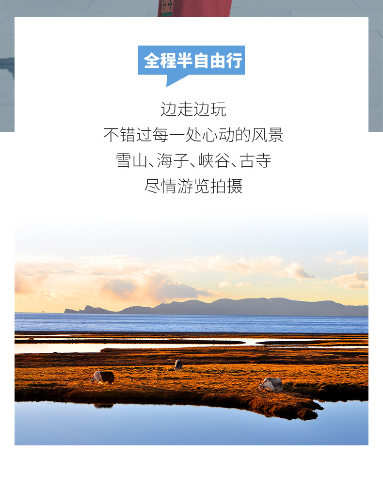 从拉萨出发,沿拉日高速,驶上被称为观光大道的S307省道, 翻越海拔4990米的【岗巴拉雪山】前往【羊卓雍措(简称羊湖)】。 羊湖是西藏三大圣湖之一的淡水湖,湖水甘甜、如羊脂般清澈,可以饮用。 湛蓝的湖水与远方的雪山连为一体,加上两岸各色的山脉、极具特色的藏族村落、遍地的牛羊,一路走来,心旷神怡。 【岗巴拉山顶】是欣赏羊湖最佳位置,建议游玩时间30分钟左右。 山下的观景台是可以近距离接触羊湖的地方,如果天气好的话,可以看到远处的宁金抗沙峰,许多登山爱好者会在这座山峰攀登训练。 碧蓝的羊湖和远处白雪皑皑的雪山,遥相呼应,简直就是眼睛的天堂。欣赏完美丽的羊卓雍措,开始返程。 如果有需要送机或送火车的小伙伴,请提前告知司机师傅你们的航班/车次,让师傅提前规划送机/站时间,以免耽误您的行程。 特别提醒: (1)以上行程及时间可能会因天气、路况等原因做相应调整,具体以实际出发行程及时间为准。正常情况下完团回到拉萨时间为下午17:00-18:00,下午回拉萨的途中可以顺道送机/站,有需要的队员请提前告知司机,如果必须当日离开,请定18:00以后的航班/车次,以免耽误行程; (2)拉萨散团日当天不含住宿,如需代定,请提前联系客服; (3)赠送项目如客人自愿放弃或因特殊原因及不可抗力等原因无法参加,均不退费用,也不等价交换。 |