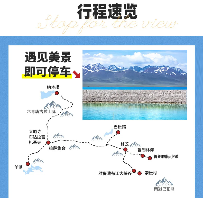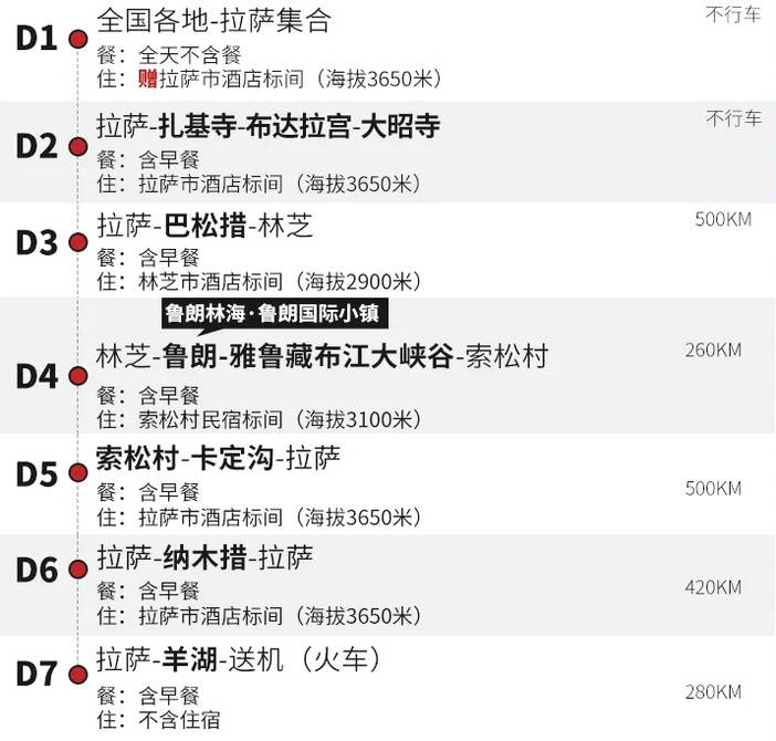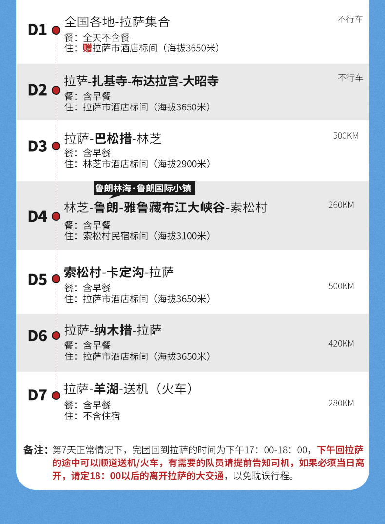 1.大交通:不含往返拉萨的大交通。 2.用餐:全程午餐、晚餐均不含,需自理(其余早餐为赠送,不用不退),大家可以一起AA,也可以单独用餐,路上川菜餐厅为主。 3.单房差:报价均按2人入住1间房核算,如出现单人数(例如:3人、5人、7人),请另补单房差;如果队员要求自己单独住一间房,请在报名时告知客服,并自补单房差;如果在集合日或行程进行中选择单独住一间房,则需补一间房的费用(单房差*2)。 4.门票: ①布达拉宫门票200元/人(预约费另计); ②大昭寺门票85元/人; ③巴松措门票120元/人、巴松措观光车45元/人、巴松措游船票150元/人; ④鲁朗林海门票30元/人; ⑤雅鲁藏布江大峡谷门票150元/人、雅鲁藏布脁和江大峡谷观光车90元/人、索松村观光车90元/人; ⑥卡定沟门票28元/人; ⑦纳木措门票110元/人、纳木措观光车100元/人; ⑧羊湖门票100元/人; 5、其他:不含各种个人开支; 6、不可抗力:如果因为人力不可抗拒因素(如塌方、泥石流、路桥被毁、航班延误、国家政策、战争、瘟疫、交通管制、堵车等)导致不能履行合同和旅程变化,我社不承担相关赔偿。 |