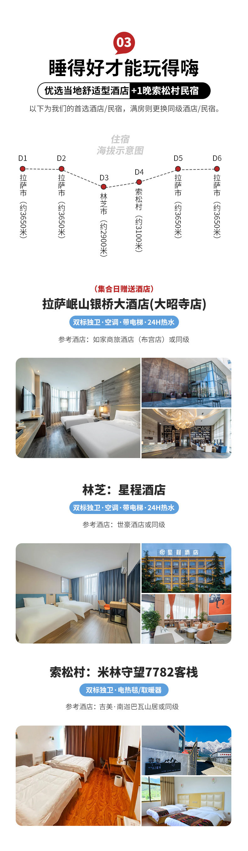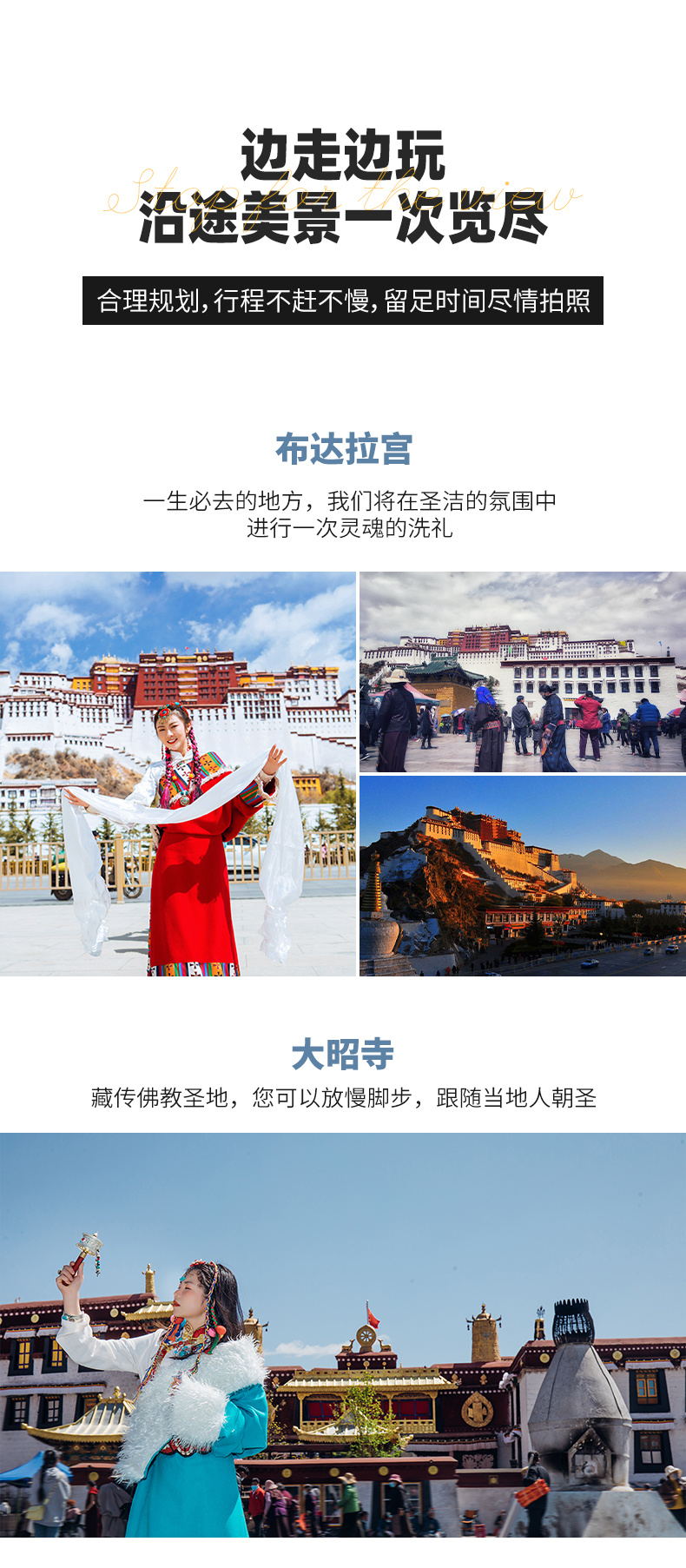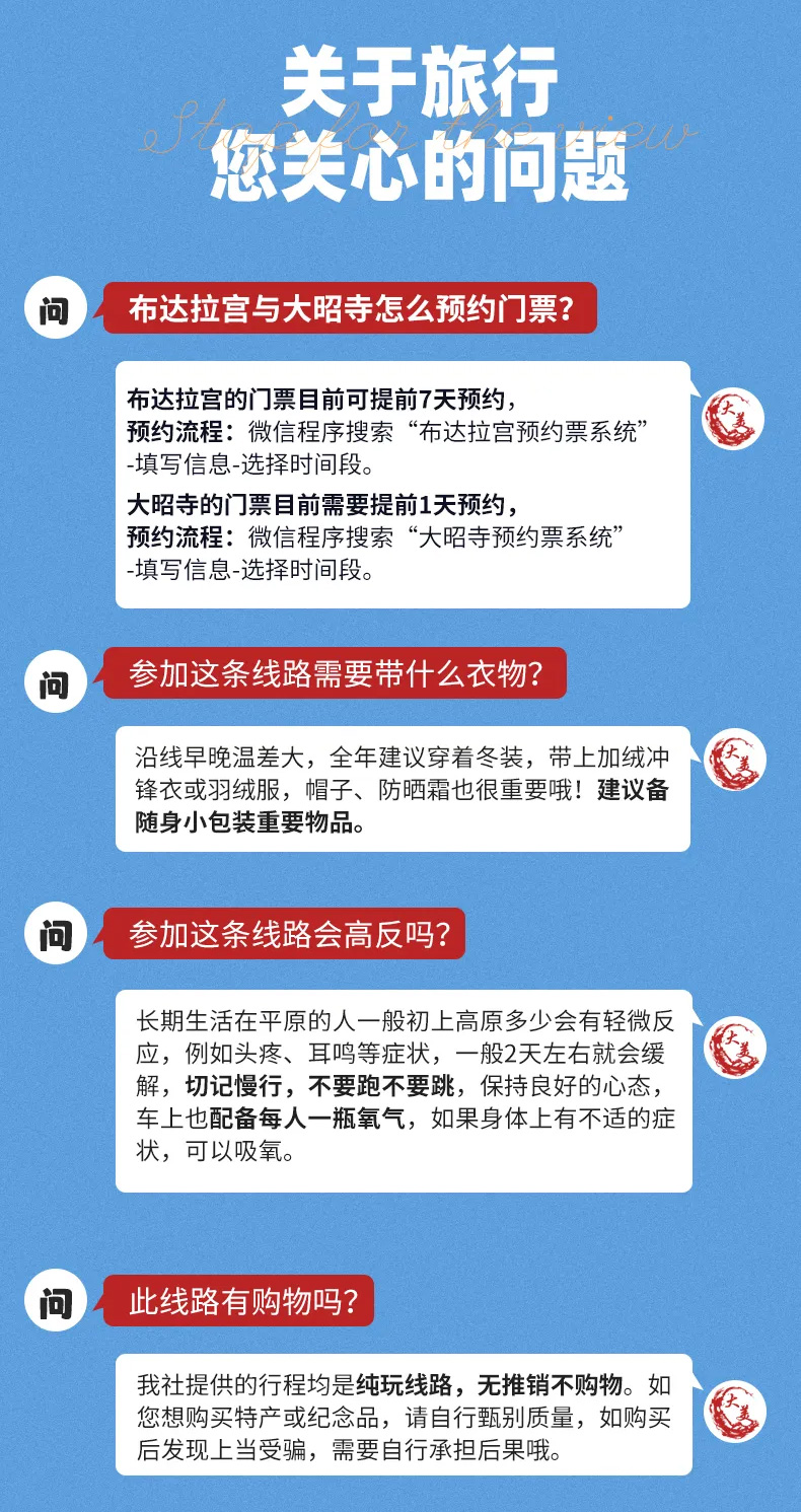 1.两人成行,全年随时可出发;如您需要拼团,请在报名时告知我社工作人员,我们会尽量帮忙安排拼团,如拼团成功则按实际出行人数支付费用;如拼团失败,则按独立成团人数支付费用。 2.以上价格均按2人入住1间房核算,如出现单人数(例如:3人、5人、7人),请另补单房差。 3.关于布达拉宫门票的预约:提前7-15天预约(预约时间时常变动,请及时关注官方小程序放票情况),预约流程:微信小程序搜索“布达拉宫票务预订票系统”-填写信息-选择时间段。 关于大昭寺门票的预约:目前需要提前1天预约,预约流程:微信小程序搜索“大昭寺官方预约”-填写信息-选择时间段。 活动有自费项,注意查看费用不含 线路纯玩,不安排购物点 |