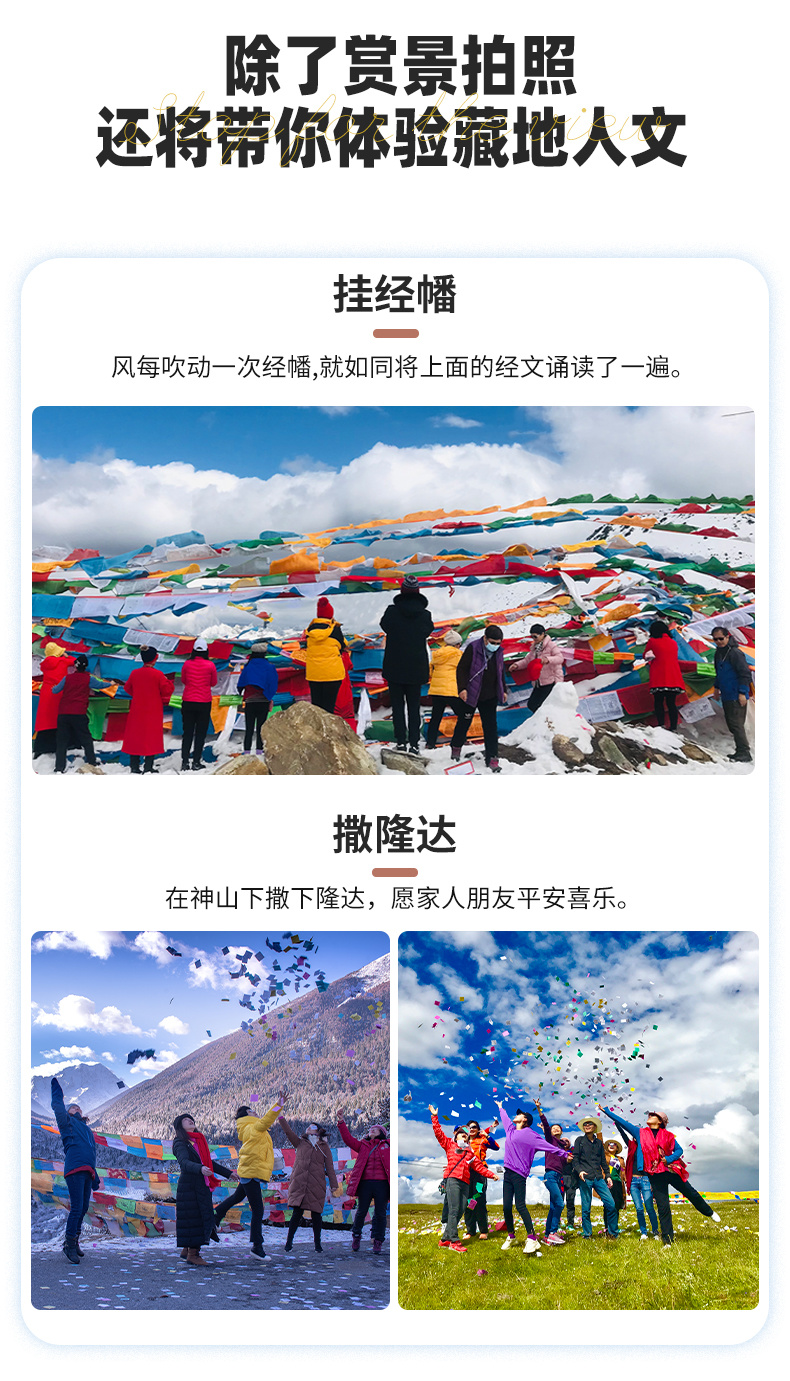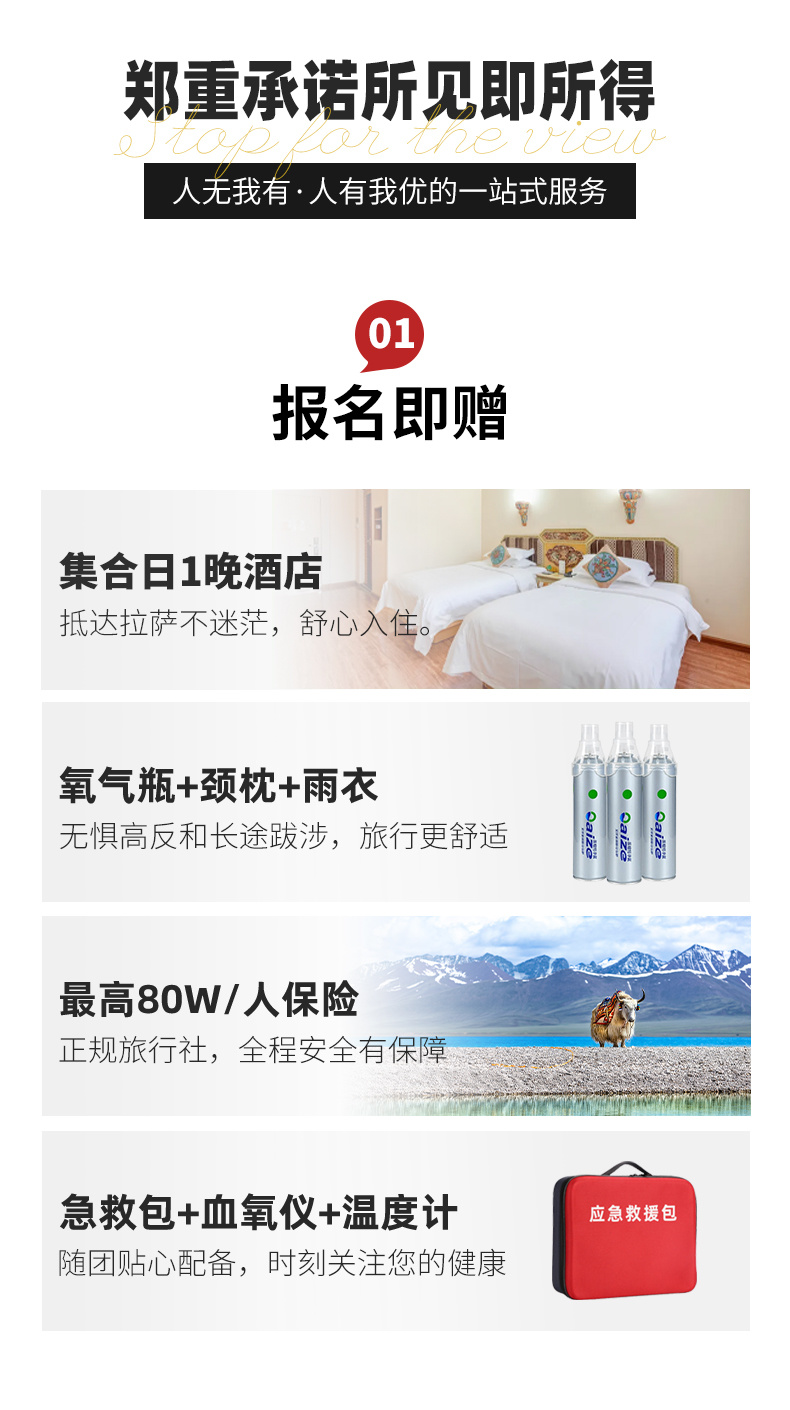 ①用餐:赠送全程6个早餐。 ②最高保额为80万元的旅游意外险(不含财产险)(中国银保监会规定:不满10周岁80万的额度下降至20万已满10周岁但未满18周岁80万的额度下降至50万)。注:港澳人士仅限大陆三甲医院就医才可报销,如离开大陆就医不予报销。 ③颈枕+两件式套装雨披+瓶装氧气,每人一套。 ④送机/站请提前1天告知航班号/车次,否则视为放弃此服务; ⑤藏地人文体验:挂经幡、撒隆达。 赠送项目如客人自愿放弃或因特殊原因及不可抗力等原因无法参加,均不退费用,也不等价交换。 |