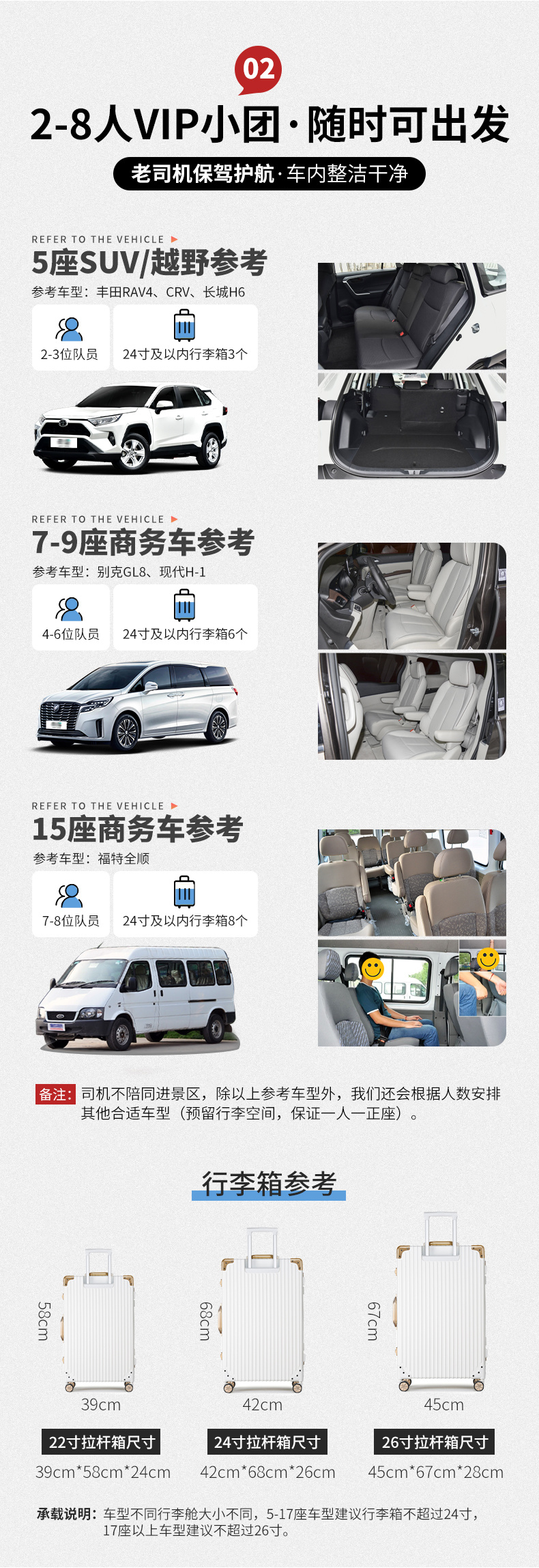 1.交通司兼导:5-15座全程专属用车及司机星级服务(全程司机兼向导已含驾驶员食宿,驾驶员熟悉线路,会给队员提供行程建议,全程边走边玩,保证多次停车服务,但不会像专业导游一样解说,且不陪同队员进景区,请理解) 2-3位队员乘坐5座SUV/越野; 4-6位队员乘坐; 7-9座商务车; 7-8位队员乘坐15座商务车; 2.住宿:全程6晚住诎蟥摈琴定宿(含集合日1晚赠送酒店、不住不退)。 3.随团配备:急救包+血氧仪+温度计,随时观察了解客人的身体状况。 |