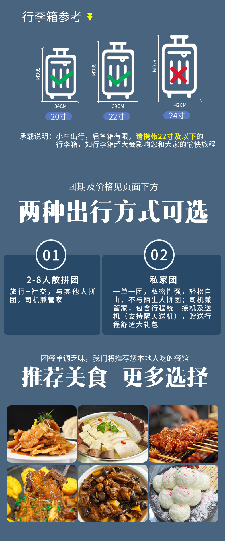 1、本产品不接受以下旅游者报名:传染性疾病、心脑血管疾病、呼吸系统疾病、精神病、严重贫血病、大中型手术的恢复期病患者、75周岁(含)以上老年人、孕妇及行动不便者以及其他不适宜出行者。出于旅游安全考虑,建议旅游者在出行前做一次必要的身体检查,预订人请务必准确、及时转达并核实旅游者的身体状况后再报名,否则由此引发的不良后果和所有费用由预订人和旅游者自行承担。 2、请您在预订时务必提供准确、完整的信息(姓名、性别、证件号码、国籍、联系方式、是否成人或儿童等),以免产生预订错误,影响出行。如因客人提供错误个人信息而造成损失,我社不承担任何责任。 3、港澳台同胞、外籍游客部分区域有限制要求,报名前请咨询客服具体情况。 4、18岁以下未成年人不可单独报名,需要至少一名18周岁以上59周岁以下直系亲属全程陪同方可报名。 5、70周岁(含)以上老年人预订出行需确保身体健康适宜旅游,并有18周岁以上59周岁以下直系亲属全程陪同出行。 6、涉及高海拔地区(包括西藏、青海、四川、云南、贵州、新疆、甘肃部分地区等)线路,因地理环境的特殊性,以及个人身体素质条件不同,可能个体会出现不同程度的高原反应,建议根据自身情况做好相关评估和准备。行程中,出现严重的高原反应请及时通知服务人员或旅行社,旅行社将给予必要的协助,但产生额外的救助费用将由个人承担,如决定中途退团的,仅退还未产生的门票费用。 7、请在约定的时间到达集合地点,切勿迟到,以免耽误您和其他游客行程。若因迟到导致无法随团游览,将按照当天解除合同处理,或您也可以与旅行社协商自行前往下一集合地点,但因此增加的费用由您自理,因行程耽误而没有参加的交通、景区、活动、住宿等费用无法退还。 8、本产品行程实际出行中,在不减少景点且征得客人同意的前提下,我司服务人员可能会根据天气、交通等情况,对您的行程进行适当调整(如调整景点游览顺序等),以确保行程顺利进行。 9、出游过程中,如遇不可抗力因素造成景点未能正常游玩,我司服务人员经与客人协商后可根据实际情况取消或更换该景点,或在现场按旅游产品中的门票价退还费用,退费以旅行社团队协商价为准不是景区挂牌价,敬请谅解。 10、如遇路况原因等突发情况需要变更各集合时间的,届时以我司服务人员公布为准。 11、行程中的赠送项目,如因交通、天气等不可抗因素导致不能赠送的、或因您个人原因不能参观的,费用不退,敬请谅解。 12、团队行程中,非自由活动期间,未经我司服务人员同意,不得擅自离团或脱团。 如您选择中途离团,经服务人员同意后,应签署书面离团协议,未完成部分将被视为您自行放弃,仅退还未产生的门票费用。因此产生的人身财产安全等问题,游客自负。 13、植物类景观(枫叶、樱花、油菜花等),可能会因天气原因导致观花不佳等情况,敬请谅解 14、为了记录您在旅途中的美好瞬间,服务人员可能会为您以及同行人员拍摄一些照片,这些照片可能会被选中用于本产品活动分享、产品宣传、新媒体运营等,若您不同意授权我司使用的,请您及时与领队说明。 15、本产品属于群体性活动,考虑到其他旅游者的健康和安全问题,不得携带宠物上团。 16、持老年证、军官证、军残证、残疾证、学生证、导游证等优惠证件的游客可享受景区门票优惠政策,具体以出行当日景区公布政策为准。请具备条件的游客携带好相关证件,届时由领队或我司工作人员统一安排,按打包行程中客人已享的优惠价格,现场退还差价。 |