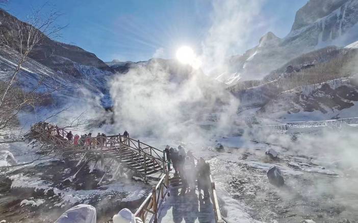 返回到中转服务站,换乘环保车赴【长白瀑布】, 车程约10分钟,步行约20分钟到达长白冰雪瀑布底部近距离观看、摄影,参观【聚龙温泉群】,周围一片白雪,中间却热气腾腾,甚是美丽,游览30分钟,步行20分钟返回瀑布停车场。 | ||