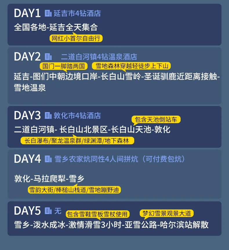 1、住宿:延吉市4钻酒店标间1晚,二道白河镇4钻温泉酒店标间1晚,敦化市4钻酒店标间1晚,雪乡4人间独立卫浴农家炕1晚(男女分开4人间拼炕) 备注:钻级标准参考携程钻级标准,东北经济发展较差,酒店已经是我们精心挑选的,但是和大城市同级别酒店相比各方面略差一些,敬请您谅解; 2、用餐:包含4顿早餐; 3、用车:2-4客人用5座SUV,5-6客人用7座商务车,7-8客人用9座商务车(小团副驾驶及前后座位置需要轮流乘坐,望悉知); 4、门票:图们中朝友谊桥门票、长白山雪岭门票、雪乡门票+往返环保车、长白山北景区全含(门票+往返环保车+摆渡车+天池倒站车)、雪乡滑雪3小时包含雪鞋雪板雪杖使用(滑雪时间从取雪具开始计算,到还雪具结束); 5、领队:司机兼管家,帮助大家购买门票,给团友游玩建议,无法全程陪同进入景区和提供专业讲解等服务,敬请谅解; |