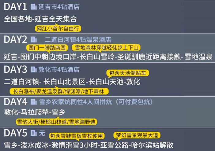D5 | 第5天,雪乡-泼水成冰-激情滑雪3小时-亚雪公路--哈尔滨站解散 | |