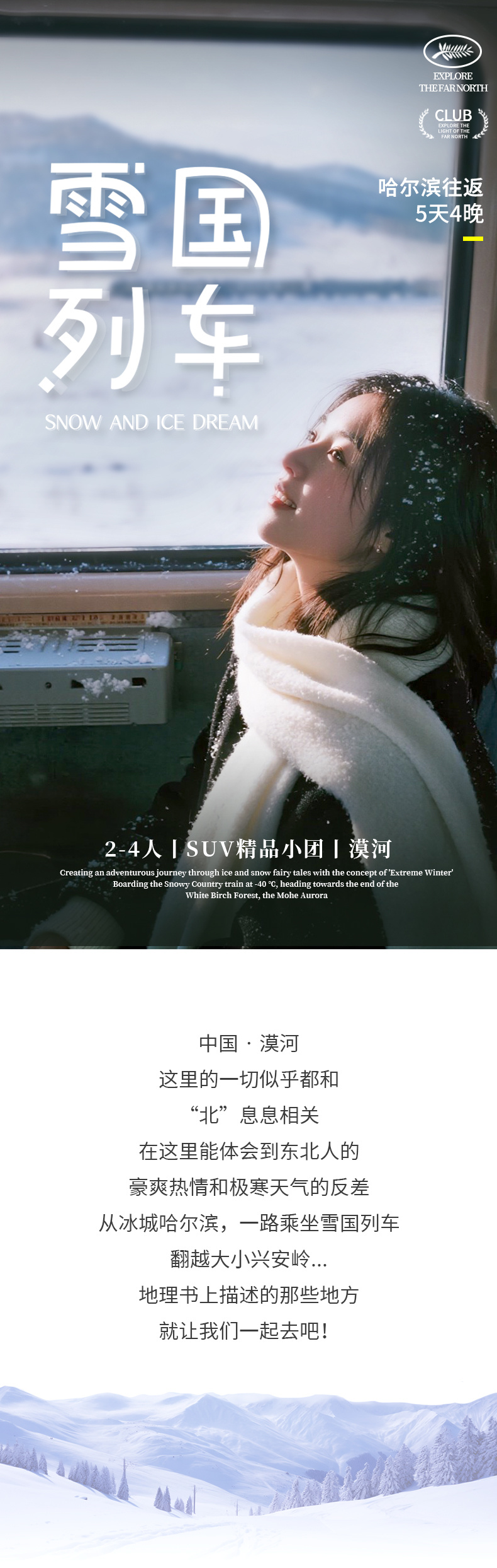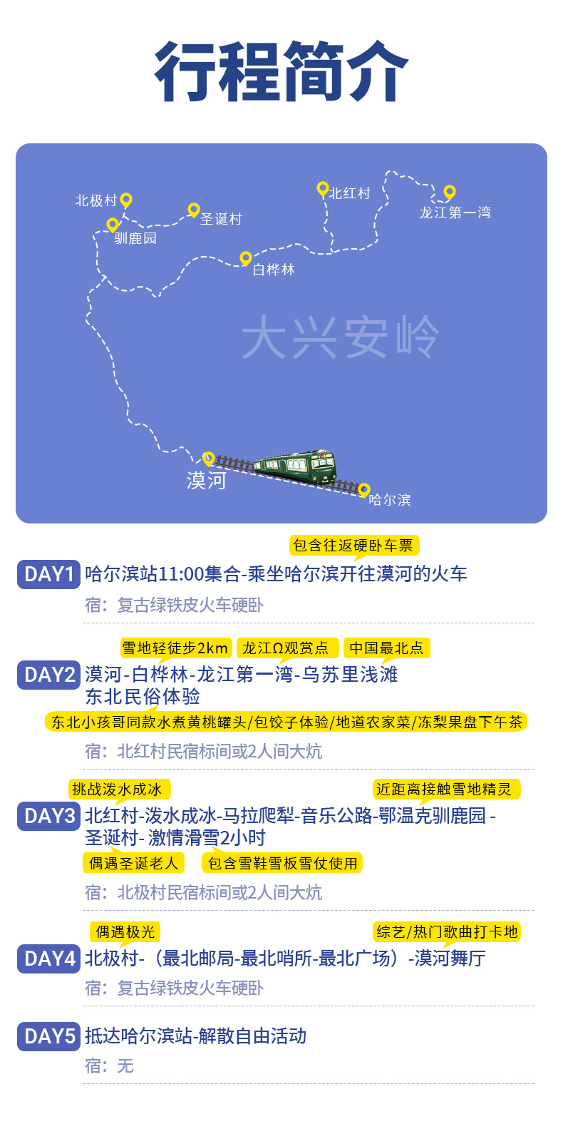 1、住宿:北红村家庭农家炕双人标间(独立卫浴)1晚、北极村家庭旅馆或农家炕双人标间(独立卫浴)1晚; 2、用餐:包含2顿早餐,火车上用餐请自行准备食物 3、用车:全程SUV越野车,4客人一车(小团副驾驶及前后座位置需要轮流乘坐,望悉知); 4、门票:龙江第一湾门票+环保车、圣诞村门票、2小时滑雪(含雪鞋/雪板/雪杖使用)、北极村门票、鄂温克驯鹿园; 5、领队:司机兼管家,帮助大家购买门票,给团友游玩建议,无法全程陪同进入景区和提供专业讲解等服务,敬请谅解; 6、火车:哈尔滨-漠河往返火车硬卧(铺位随机,一起报名的小伙伴尽量安排同一节车厢,但冬季票务紧张无法保证,建议提前15天以上预定,15天以内报名请现询是否有票) |