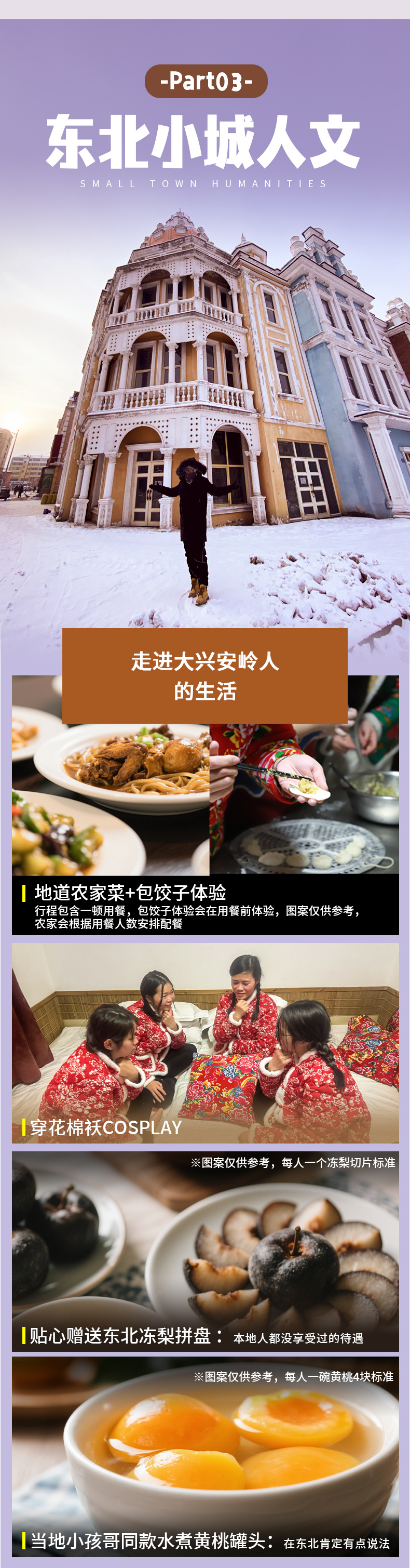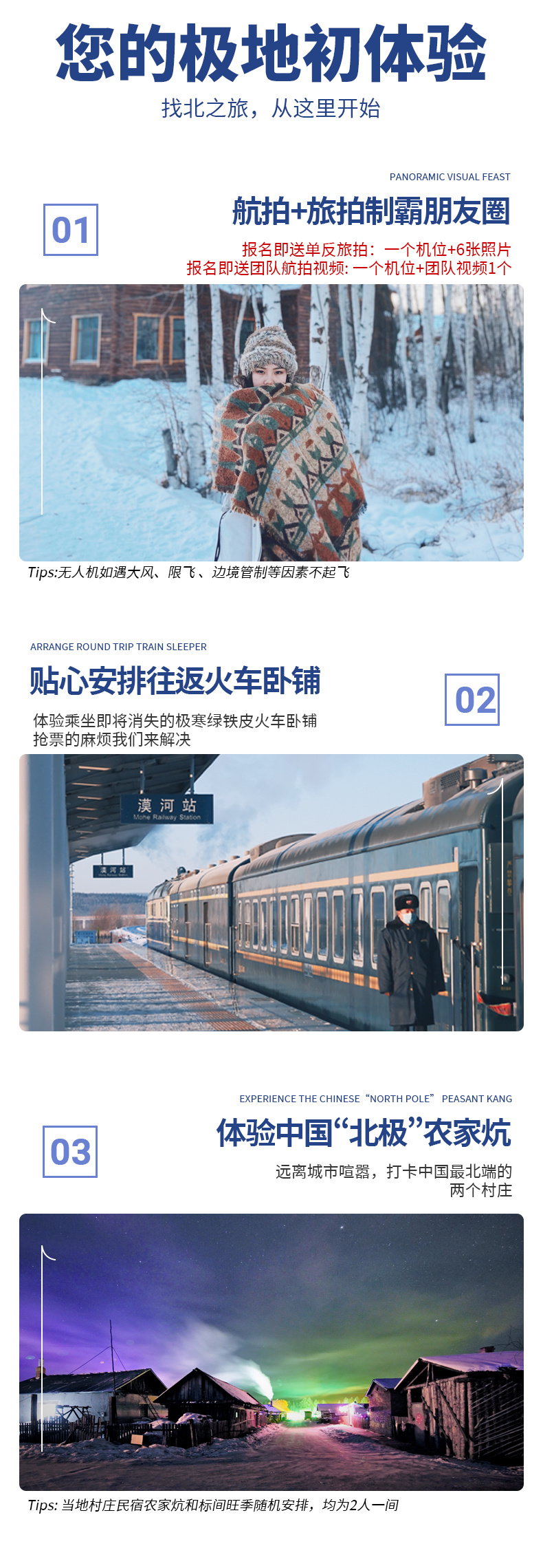 1、赠送一顿农家菜(根据人数配餐),包含饺子体验; 2、打卡漠河舞厅,重温80年代凄美旧事,舞一段烟火晨曦。 3、体验东北最古老的交通工具马拉爬犁(2-3人一个爬犁)。 4、报名即赠送单反旅拍保证一个机位+6张照片,一个机位团队航拍+1个团队航拍视频。(如遇极端天气、边境管制等不可抗力因素无人机不起飞无退费)。 5、赠送东北冻梨切片拼盘(1人一个冻梨)+水煮黄桃罐头(1人一碗4块黄桃) 6、保险:120万元保额旅行社责任险、34万元保额旅行意外保险。 赠送项目不体验或不可抗力因素无法体验不退费用 |