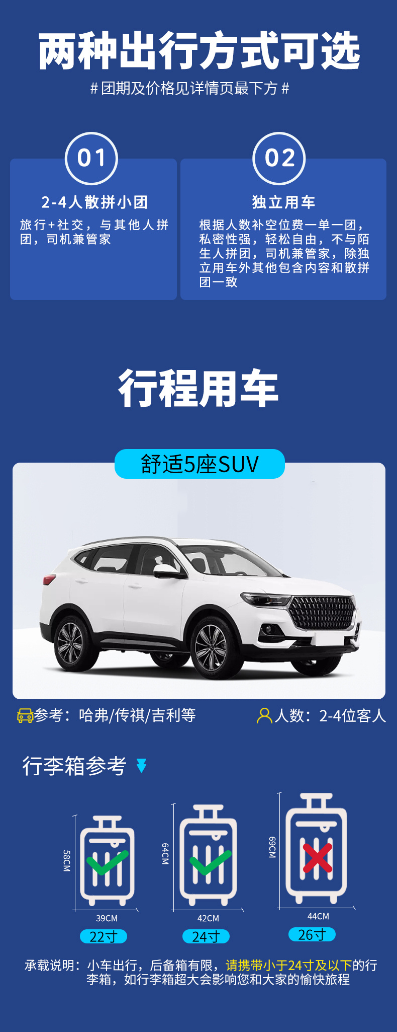 如果您有独立用车需求,我们也支持1-4人SUV独立成团,车位费特价/正价团期700元/座,圣诞/元旦/跨年/春节团期900元/座。 |