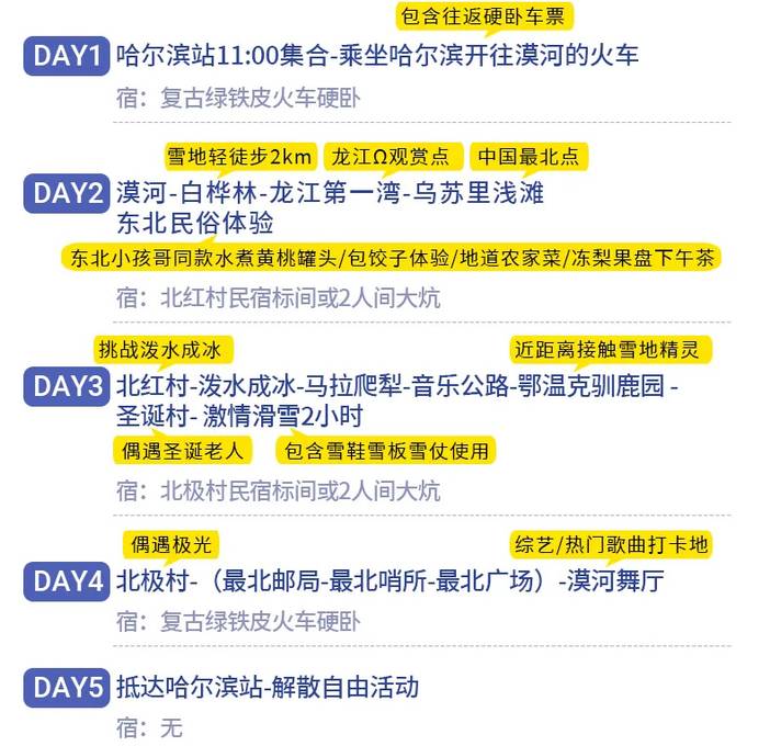 D5 | 第5天,哈尔滨站解散-全国各地 | |