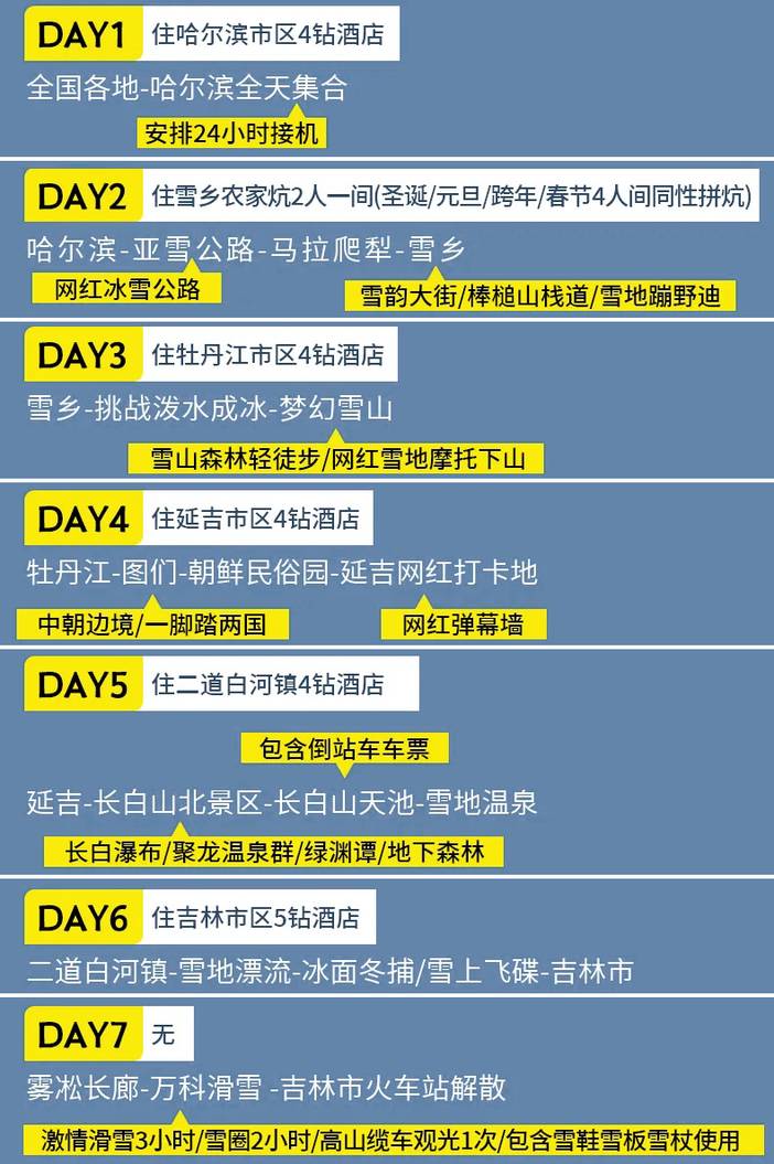 咨询成团、余位,请联系客服 第01-07期为优惠团期 成人3999元/人,儿童2399元/人,5晚酒店单房差750元/人 第01期 哈尔滨集合11-15 —— 吉林解散11-21 第02期 哈尔滨集合11-17 —— 吉林散11-23 第03期 哈尔滨集合11-19 —— 吉林散11-25 第04期 哈尔滨集合11-21 —— 吉林散11-27 第05期 哈尔滨集合11-23 —— 吉林散11-29 第06期 哈尔滨集合11-25 —— 吉林散12-01 第07期 哈尔滨集合11-27 —— 吉林散12-03 第08-11期为平价团期 成人4499元/人,儿童2699元/人,5晚酒店单房差1000元/人 第08期 哈尔滨集合11-29 —— 吉林散12-05 第09期 哈尔滨集合12-01 —— 吉林散12-07 第10期 哈尔滨集合12-03 —— 吉林散12-09 第11期 哈尔滨集合12-05 —— 吉林散12-11 第12-18期为正价团期 成人4899元/人,儿童2999元/人,5晚酒店单房差1200元/人 第012期 哈尔滨集合12-07 —— 吉林散12-13 第013期 哈尔滨集合12-09 —— 吉林散12-15 第014期 哈尔滨集合12-11 —— 吉林散12-17 第015期 哈尔滨集合12-13 —— 吉林散12-19 第016期 哈尔滨集合12-15 —— 吉林散12-21 第017期 哈尔滨集合12-17 —— 吉林散12-23 第018期 哈尔滨集合12-19 —— 吉林散12-25 第19-24期为圣诞/跨年/元旦团期 成人5199元/人,儿童3199元/人,5晚酒店单房差1250元/人 第19期 哈尔滨集合12-21 —— 吉林散12-27 第20期 哈尔滨集合12-23 —— 吉林散12-29 第21期 哈尔滨集合12-25 —— 吉林散12-31 第22期 哈尔滨集合12-27 —— 吉林散26-01-02 第23期 哈尔滨集合12-29 —— 吉林散26-01-04 第24期 哈尔滨集合12-31 —— 吉林散26-01-06 第25-44期为正价团期 成人4899元/人,儿童2999元/人,5晚酒店单房差1000元/人 第25期 哈尔滨集26-01-02 — 吉林散01-08 第26期 哈尔滨集26-01-04 — 吉林散01-10 第27期 哈尔滨集26-01-06 — 吉林散01-12 第28期 哈尔滨集26-01-08 — 吉林散01-14 第29期 哈尔滨集26-01-10 — 吉林散01-16 第30期 哈尔滨集26-01-12 — 吉林散01-18 第31期 哈尔滨集26-01-14 — 吉林散01-20 第32期 哈尔滨集26-01-16 — 吉林散01-22 第33期 哈尔滨集26-01-18 — 吉林散01-24 第34期 哈尔滨集26-01-20 — 吉林散01-26 第35期 哈尔滨集26-01-22 — 吉林散01-28 第36期 哈尔滨集26-01-24 — 吉林散01-30 第37期 哈尔滨集26-01-26 — 吉林散02-01 第38期 哈尔滨集26-01-28 — 吉林散02-03 第39期 哈尔滨集26-01-30 — 吉林散02-05 第40期 哈尔滨集26-02-01 — 吉林散02-07 第41期 哈尔滨集26-02-03 — 吉林散02-09 第42期 哈尔滨集26-02-05 — 吉林散02-11 第43期 哈尔滨集26-02-07 — 吉林散02-13 第44期 哈尔滨集26-02-09 — 吉林散02-15 第45-51期为春节团期 成人5899元/人,儿童3699元/人,5晚酒店单房差1400元/人 第45期 哈尔滨集26-02-13 — 吉林散02-19 第46期 哈尔滨集26-02-15 — 吉林散02-21 第47期 哈尔滨集26-02-17 — 吉林散02-23 第48期 哈尔滨集26-02-18 — 吉林散02-24 第49期 哈尔滨集26-02-19 — 吉林散02-25 第50期 哈尔滨集26-02-20 — 吉林散02-26 第51期 哈尔滨集26-02-21 — 吉林散02-27 第52期为正价团期 成人4899元/人,儿童2999元/人,5晚酒店单房差1200元/人 第52期 哈尔滨集26-02-23 —— 吉林解散03-01 第53-54期为优惠团期 成人3999元/人,儿童2399元/人,5晚酒店单房差750元/人 第53期 哈尔滨集26-02-25 — 吉林散03-03 第54期 哈尔滨集26-02-27 — 吉林散03-05 线路纯玩,不安排购物点 活动支持2~12人包团,费用4199~8799元不等请咨询客服 |