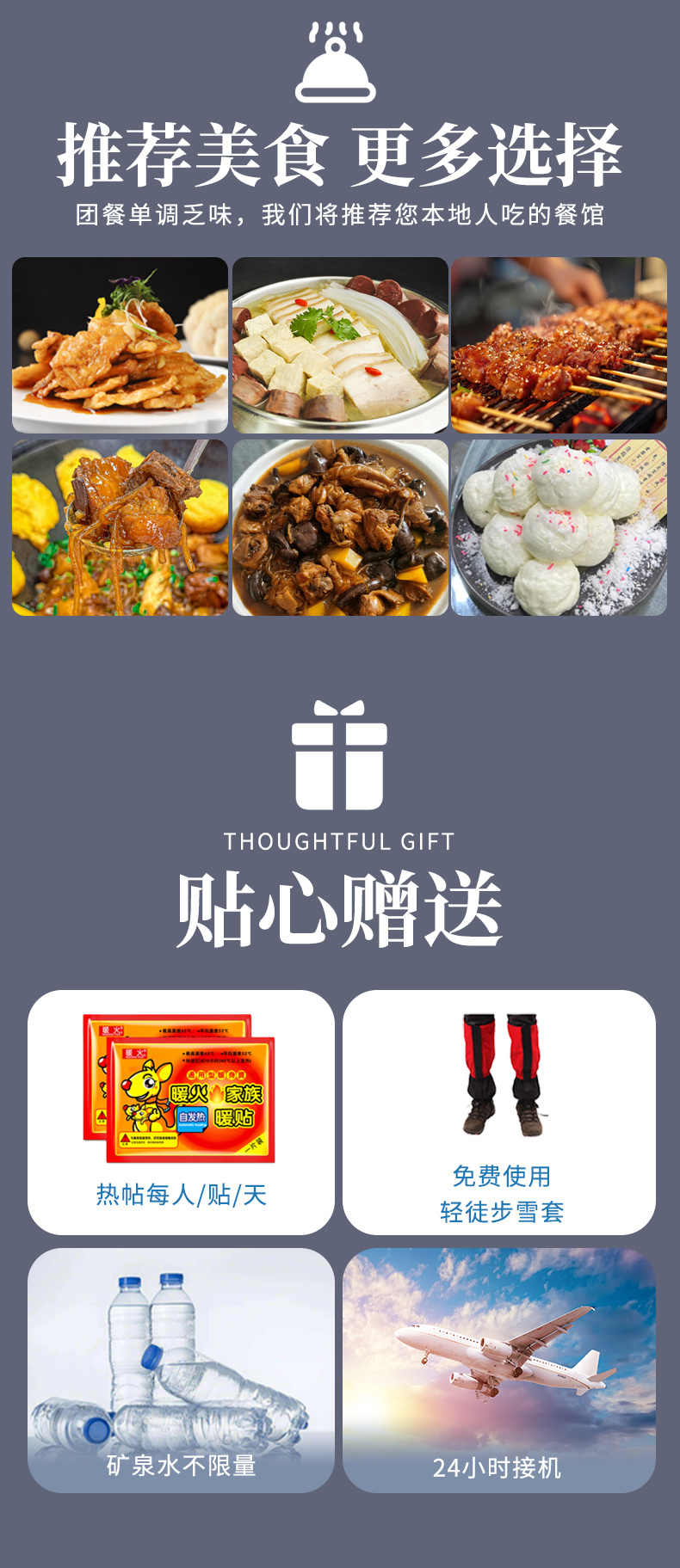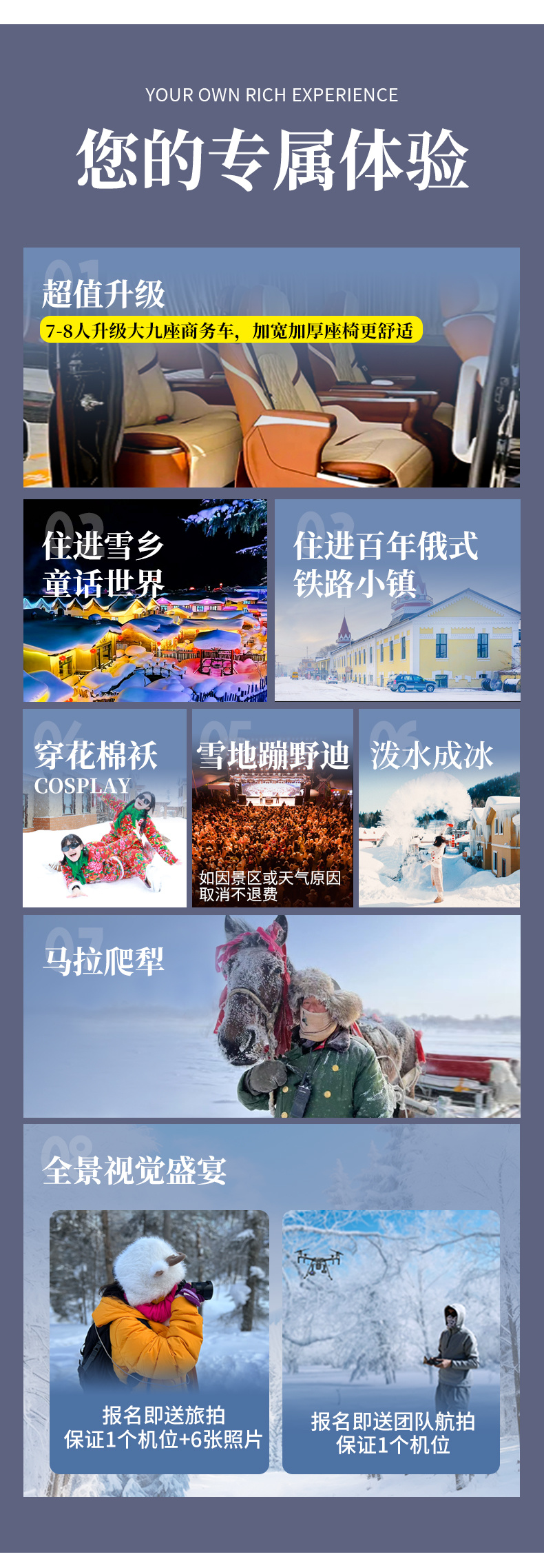 1、赠送梦幻雪山上下山雪地摩托往返一共两次。 2、赠送24小时接机服务,1人也可接,前后航班相差半小时需等待,提前2日预定,否则视为自动放弃;接机车辆非行程用车并且无空座率。 3、赠送雪乡雪地蹦迪晚会(如遇景区原因或大风等天气原因不举办不退费用)。 4、赠送热帖一人3片,矿泉水不限量,时令水果供应; 5、报名即旅拍,保证1个机位+6张照片,送定点团队航拍,保证一个机位。 6、保险:120万元保额旅行社责任险、34万元保额旅行意外保险。 赠送项目不体验或不可抗力因素无法体验不退费用 |