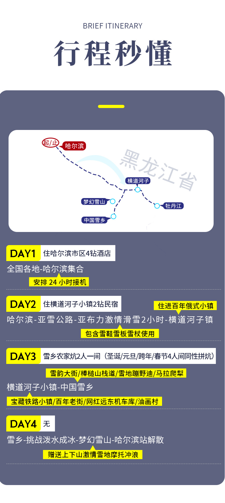 小贴士: 1、返程火车建议定20:00以后的车次,返程机票建议定23:00以后起飞的航班。 2、赠送雪地摩托上下山共两次,旺季时可能会需要排队乘坐,不体验不退费用。 3、想在哈尔滨再住一晚的小伙伴,也可以联系客服代订哈尔滨酒店。 |