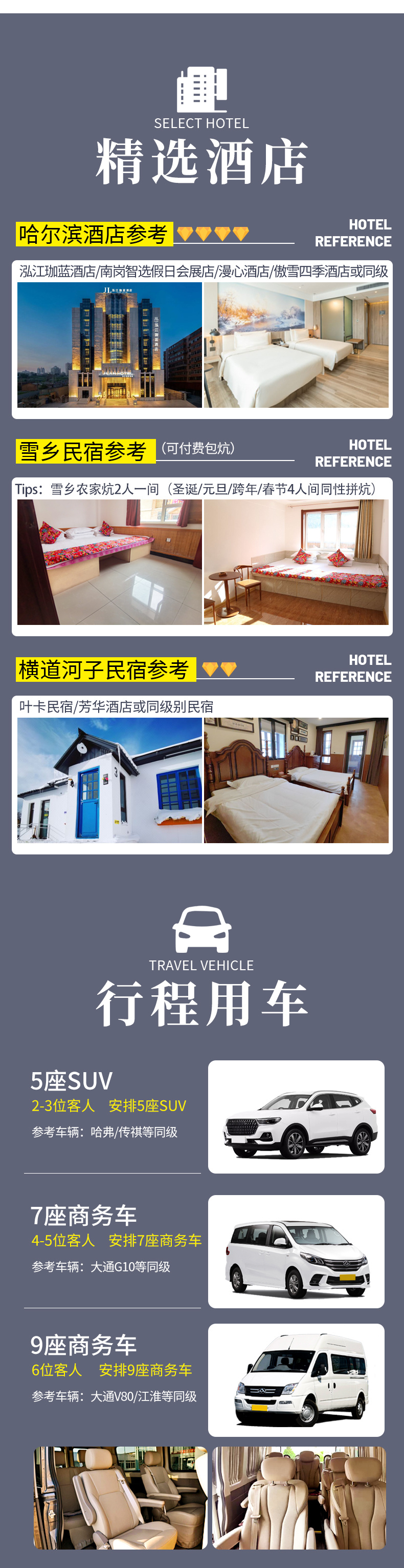 1、住宿:哈尔滨4钻酒店标间1晚,横道河子镇民宿标间1晚(如遇满房改住海林/牡丹江4钻酒店标间),雪乡2人间独立卫浴农家炕(圣诞/跨年/元旦/春节团期为男女分开4人间拼炕) 备注:钻级标准参考携程钻级标准,东北经济发展较差,酒店已经是我们精心挑选的,但是和大城市同级别酒店相比各方面略差一些,敬请您谅解; 2、用餐:包含3顿早餐(D2早餐打包); 3、用车:2-3客人用5座SUV,4-5客人用7座商务车,6客人用9座商务车,7-8客人用大九座商务车,保证旅途舒适舒心。(小团副驾驶及前后座位置需要轮流乘坐,望悉知) 4、门票:雪乡门票+往返环保车、亚布力3小时滑雪包含雪鞋雪板雪杖使用(滑雪时间从取雪具开始计算,到还雪具结束) 5、领队:司机兼管家,帮助大家购买门票,给团友游玩建议,无法全程陪同进入景区和提供专业讲解等服务,敬请谅解; |