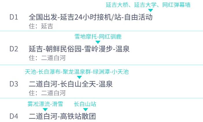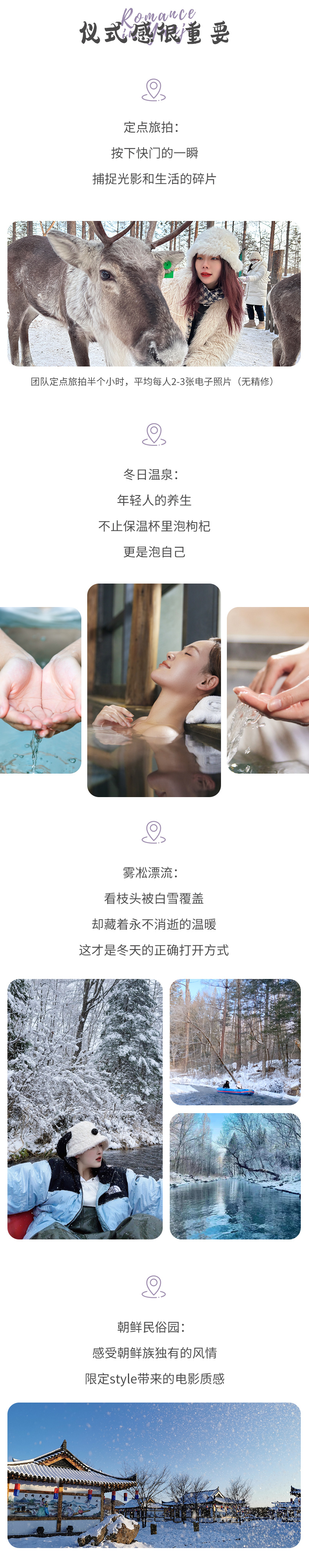 小贴士: 1、 温泉请提前准备泳衣,现场购买较贵,泡温泉过程中请不要拍照,避免影响他人感谢您的理解。 2、 旺季雪岭景区会出现排队情况,请做好保暖措施。 3、延吉朝鲜民俗园服装、妆造、旅拍费用自理。 4、 11月下旬之前,如遇气候原因雪量不够,无法运行雪地摩托,需要徒步进入景区观看驯鹿,或者取消雪岭行程,费用现退。 5、赠送团队定点旅拍半个小时,平均每人2-3张电子照片(无精修,不指定景点) |