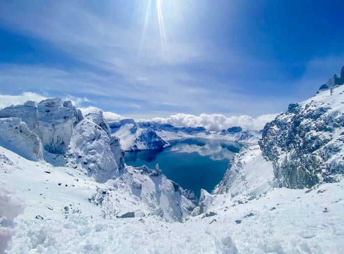 如果天气好大家可以换乘倒站车20分钟抵达天池主峰停车场,爬上5分钟到山顶,俯瞰美丽的天池,自由摄影30分钟。 | ||