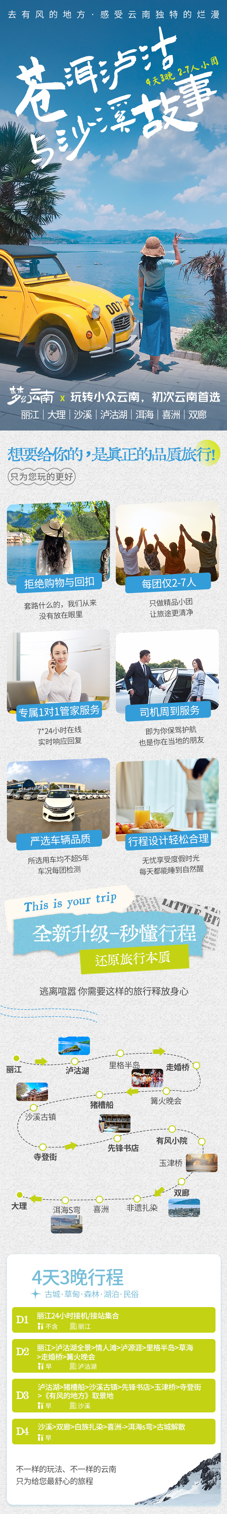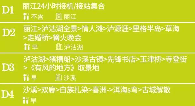 1、住宿: 丽江三钻酒店1晚(参考酒店:溪玥美宿酒店(丽江古城店)或丽江璟瑞酒店或丽怡酒店(丽江古城区雪山路店)或丽江吉铂隆大酒店或同等级), 泸沽湖三钻酒店/民宿1晚(参考酒店:泸沽湖清尘别院或泸沽湖清尘智能美宿或泸沽湖隐庐精品湖景美宿或同等级), 沙溪三钻酒店/民宿1晚(参考酒店:沙溪一半民宿或沙溪古镇云归处客栈或沙溪古镇三家巷客栈(二号院)或沙溪古镇一方庭民宿或沙溪古镇玉峰客栈或同等级); 2、用餐:全程含早,正餐自理(不占床不含早餐); 3、用车:2-3人安排国产或合资SUV/轿车,4-5人安排7座商务车,6-7人安排9座商务车; 4、门票:泸沽湖,猪槽船,白族扎染; 5、司导:司机兼管家,帮助大家购买门票,给团友游玩建议,无法全程陪同进入收费景区和提供专业讲解等服务,敬请谅解; |