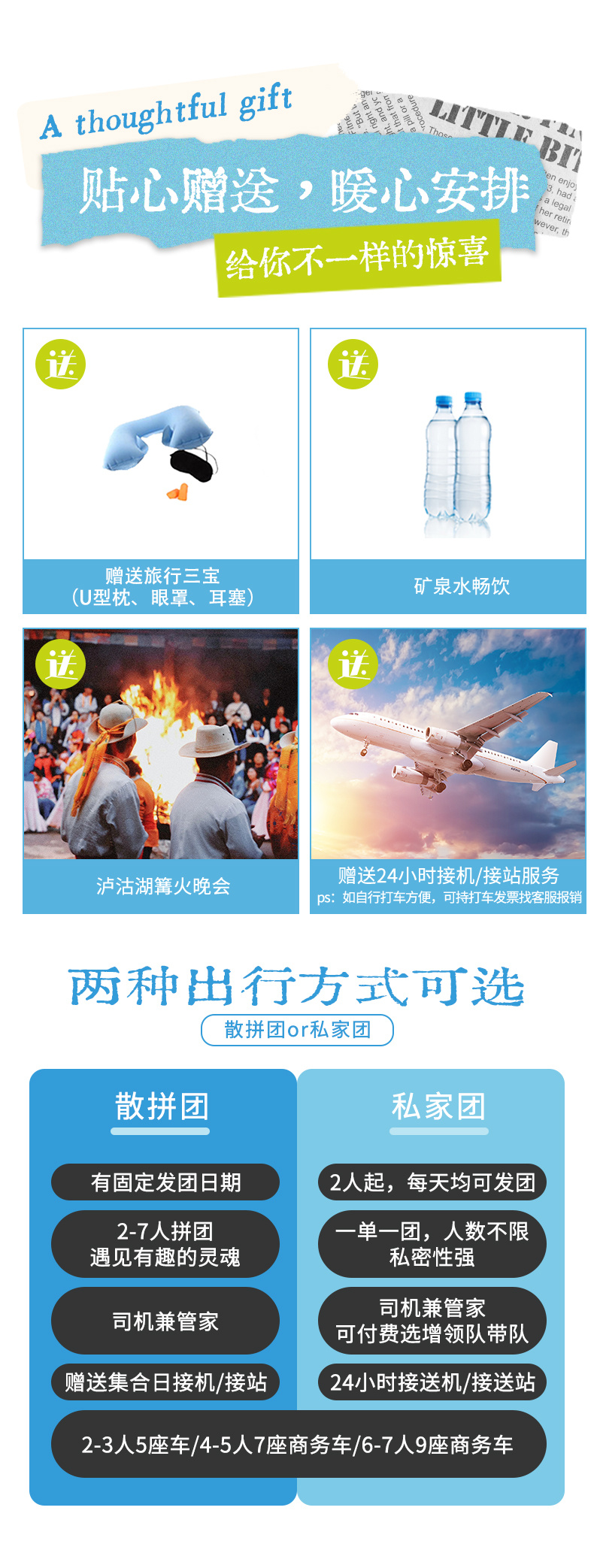 1、赠送旅行三宝(U型枕、眼罩、耳塞); 2、泸沽湖篝火晚会; 3、赠送24小时接机/接站服务(如自行打车方便,可持打车发票找客服报销); 4、每人每天一瓶矿泉水。 5、保险:80万元保额旅行社责任险、34万元旅游意外险。 赠送项目不体验或不可抗力因素无法体验不退费用 |